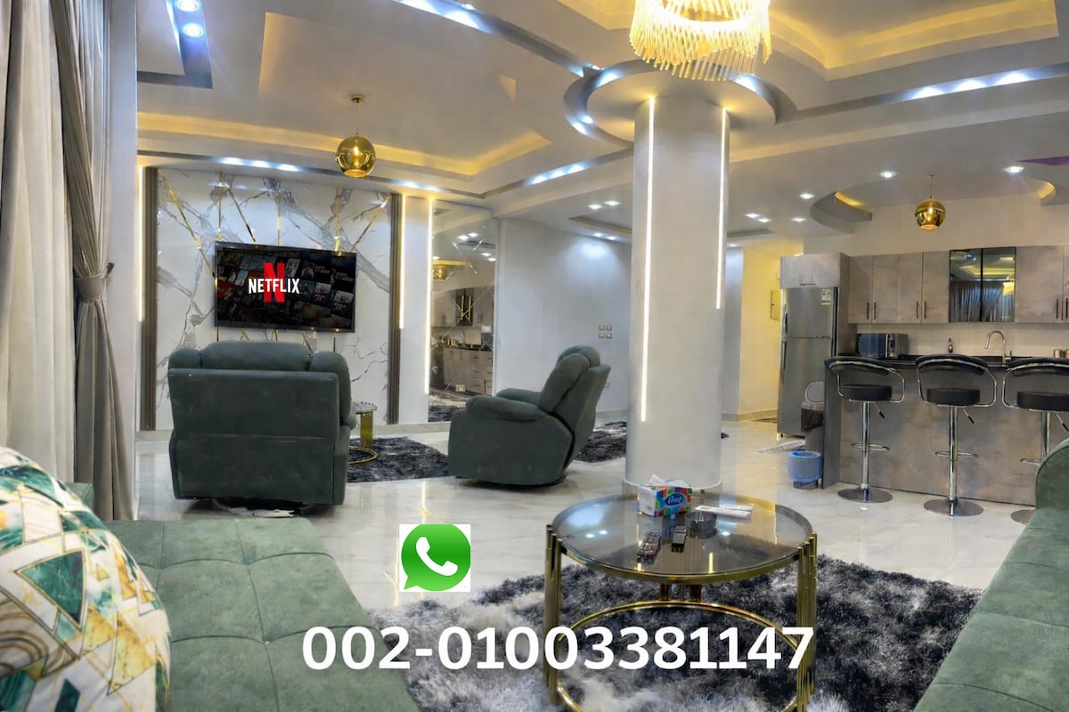 This private apartment is close to everything, near El-Hosary Square, MSA University, Carrefour Al-Wahat, and El-Hosary Mall. Mall of Egypt and Mall of Arabia are 30 minutes away. Ground floor, 3 bedrooms, 2 bathrooms, new furniture, private garden, high-speed internet, 24-hour security. Extra unregistered guests will be charged and may lead to cancellation without refund.