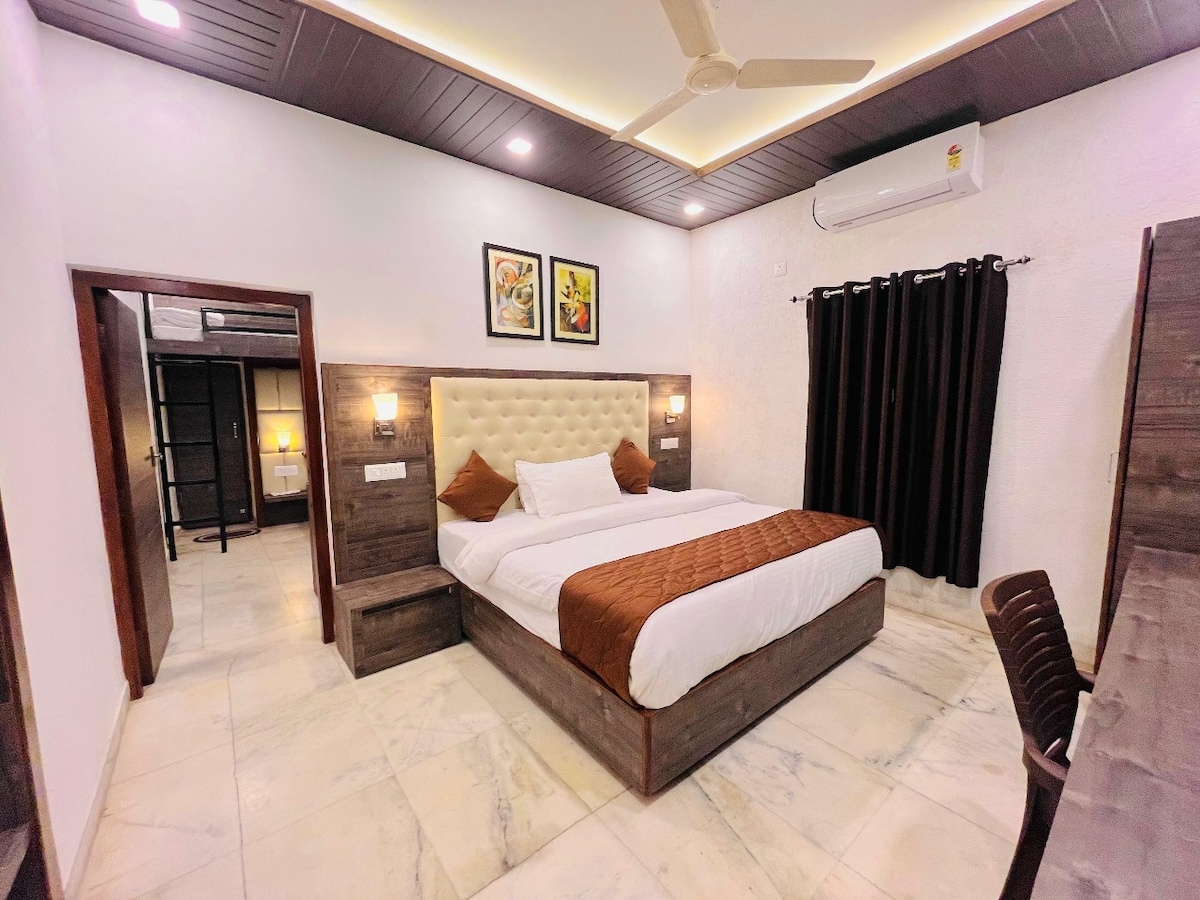 Colonel’s Villa, Abu Road — Nestled at the foothills of Mount Abu, this spacious 4-bedroom villa offers a peaceful retreat for families and friends. The villa follows a pure-vegetarian, alcohol-free policy, creating a calm and wholesome atmosphere ideal for Jain and vegetarian families. Enjoy quality time with loved ones amid serene surroundings, a private garden for kids to play with a fully equipped kitchen. Perfect for relaxation, laughter, and unforgettable evenings under the Abu sky.