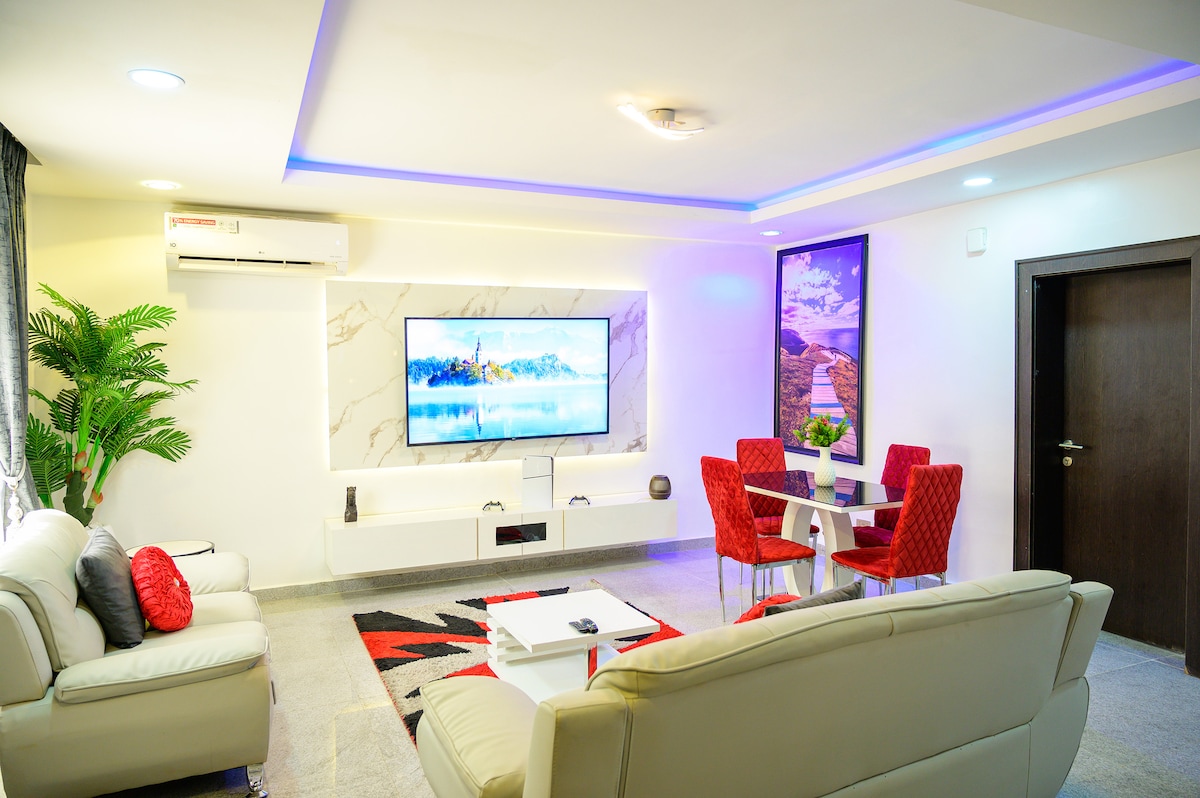 Nuestro apartamento inteligente es insuperable, ofrece a los huéspedes un apartamento moderno elegante, funcional y lujoso adaptado a todos los fines de viaje de los huéspedes. Nuestro apartamento está ubicado dentro de Suncity Estate, que está a unos 25 minutos del aeropuerto y a 20 minutos del centro de la ciudad. Los huéspedes pueden disfrutar de electricidad las 24 horas (generador de respaldo), wifi gratuito con un punto de acceso en cada apartamento para una conectividad perfecta, televisión por Internet básicamente un hogar moderno. La ubicación es serena y segura.