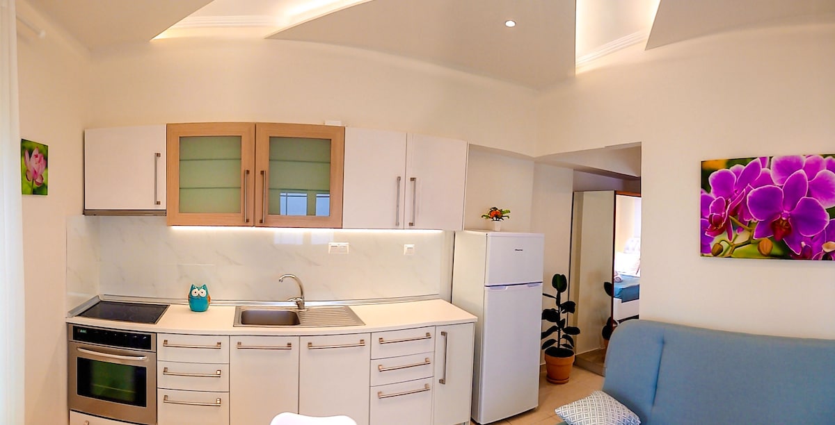 Estudio nuevo con decoración moderna con una cama tamaño queen única y diseños intrincados de falso techo (38 m²). El estudio se encuentra en el centro de la ciudad y está a menos de 10 minutos del aeropuerto y de muchos centros comerciales. A 3 minutos a pie puedes ver la plaza de la ciudad y en 10 minutos puedes estar en la presa de Thermi. Si te apetece nadar, puedes visitar Halkidiki en 30 minutos.