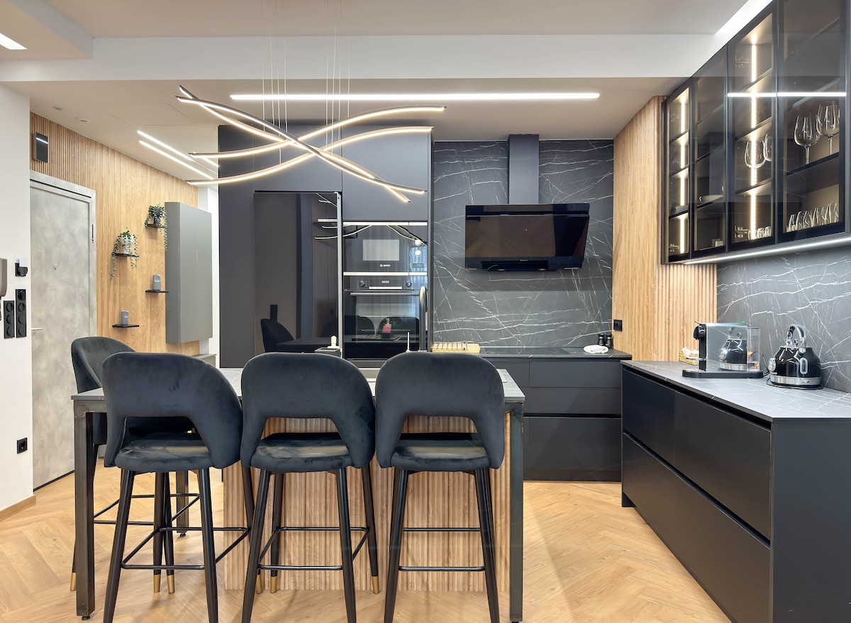 ¡Un apartamento artístico, limpio, totalmente renovado y totalmente equipado que ofrece momentos de bienestar y relajación después de un día intenso! Comodidades populares: - Asiento de masaje de estado de la técnica - Ubicación centralizada. - Cocina y baño totalmente equipados. - Wifi rápido. - Calefacción y refrigeración individuales. - Agua caliente 24/7 y agua potable filtrada - Ropa de cama superior - Balcón con hermosas vistas. - Frigorífico, horno, lavavajillas, lavadora, cafeteras, 2 televisores inteligentes, plancha, secador de pelo, pantuflas, cuna, estacionamiento fácil.