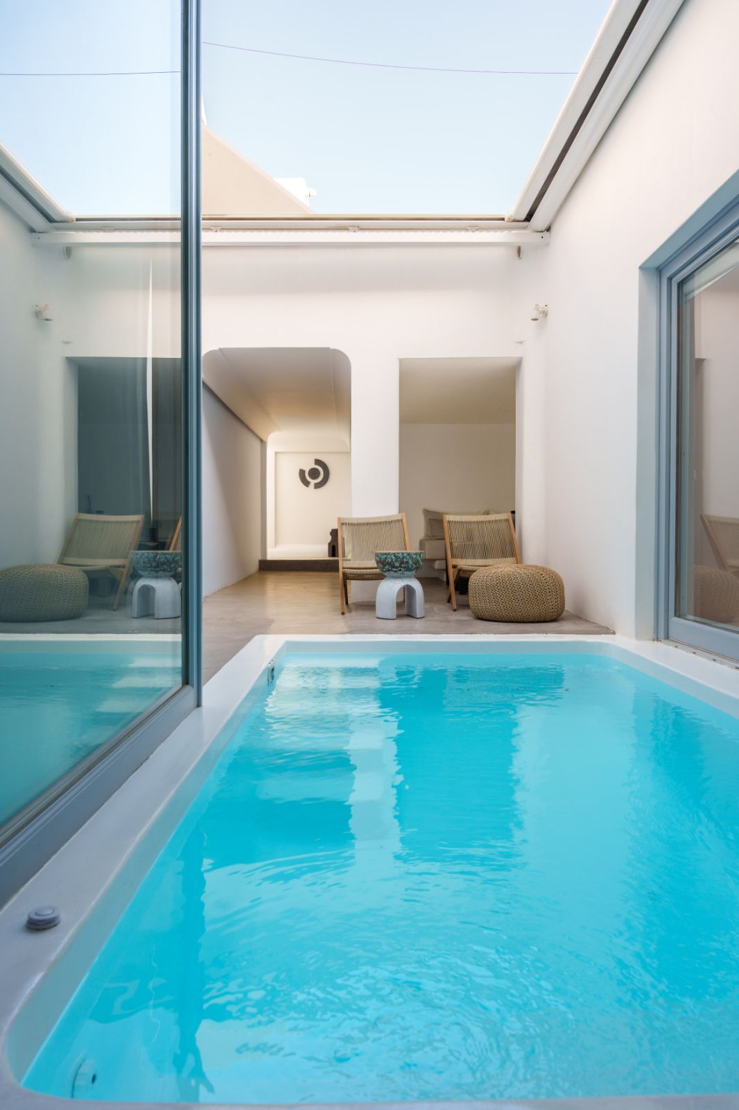 La suite está situada en la planta baja y cuenta con su propia piscina privada interior que se suma al ambiente lujoso. La arquitectura cicládica prevalece en este alojamiento que también cuenta con una cómoda cama doble, una sala de estar y una pequeña cocina. El baño tradicional con ducha incorporada completa el interior, junto con creaciones únicas de artistas griegos galardonados. En el exterior, los huéspedes pueden tomar el sol y disfrutar del ambiente de la isla desde su patio privado con tumbonas.