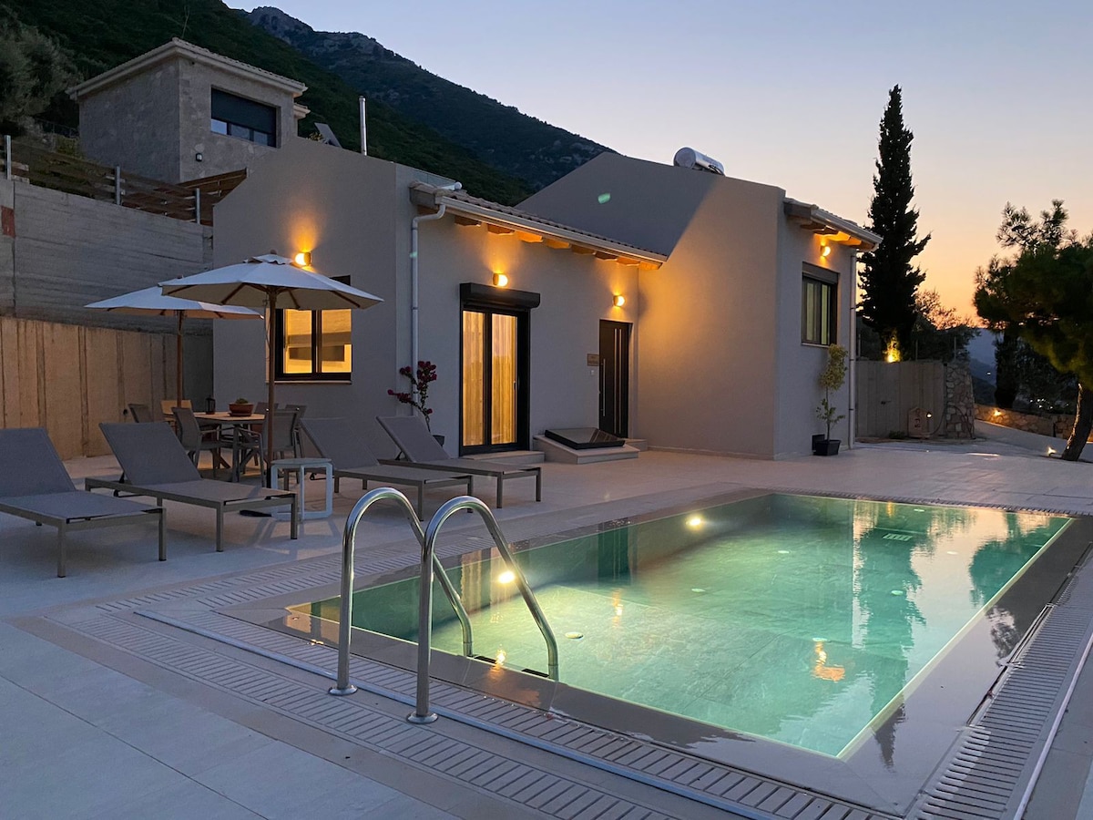 Villa de nueva construcción a los pies del monte Ainos con estacionamiento privado. Espacios al aire libre para disfrutar de la vista de la montaña con piscina, barbacoa, comedor y cenador al aire libre. En una finca de 4,5 acres con vid,olivos, cipreses y flores que está rodeada de un entorno natural puro. Espacio ideal para parejas y grupos de amigos que sobreviven a la privacidad y la relajación, adecuado para aquellos que trabajan a distancia. Cerca de Skala, Sami, Agia Efthimia, playa de Antisamos y cuevas.