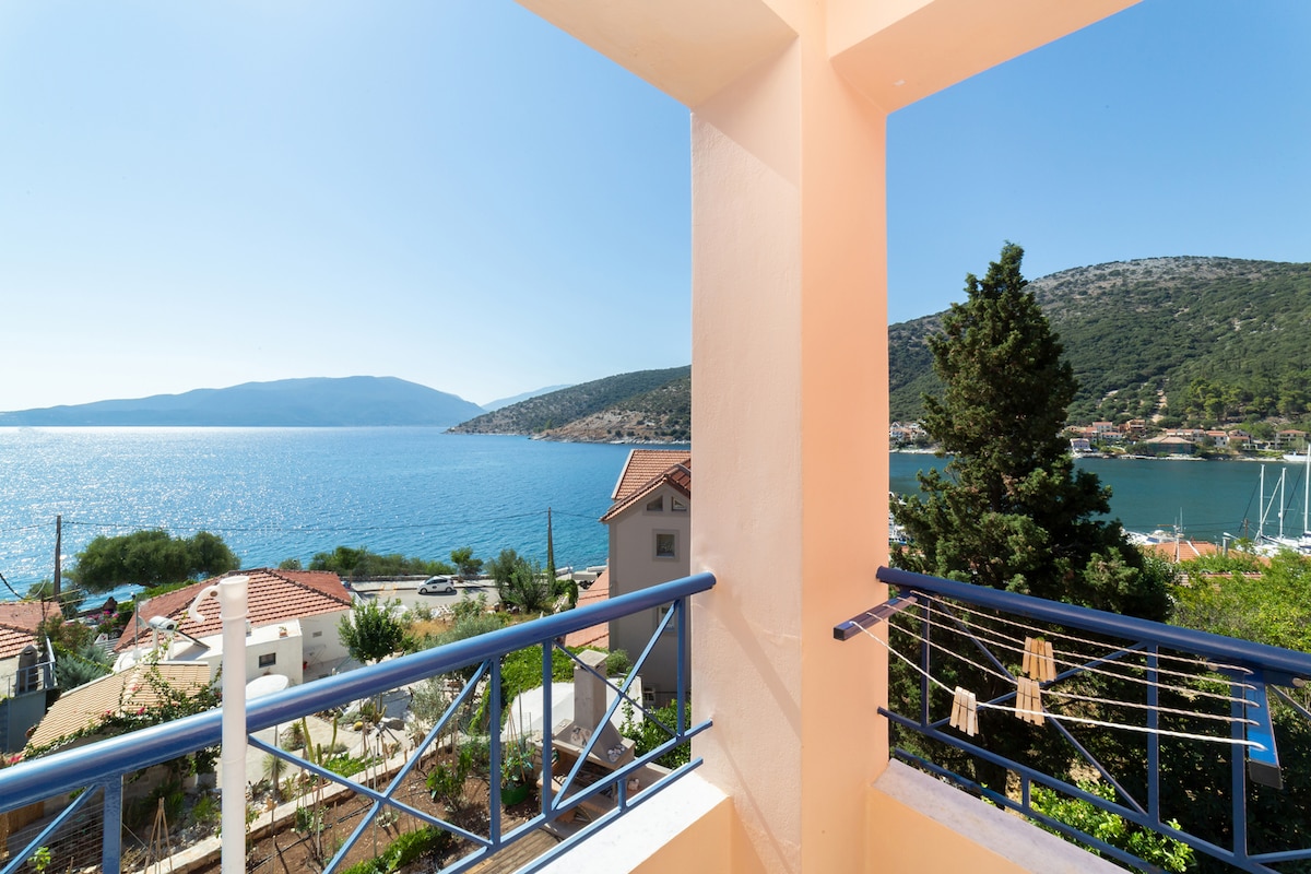 The beautiful " Panoramic Sea Mountain View Apartment " is located in the picturesque port of Agia Efimia by the sea. It has a double bed, a fully equipped kitchen, a bathroom with a washing machine, a front balcony with amazing views across the harbour and a big roof terasse with stunning sea and mountain views. Agia Efimia is in an excellent location to explore Cephalonia, near to the famous beach "Myrtos". In the area you will find many shops and restaurants, as well as bus stops and taxis.