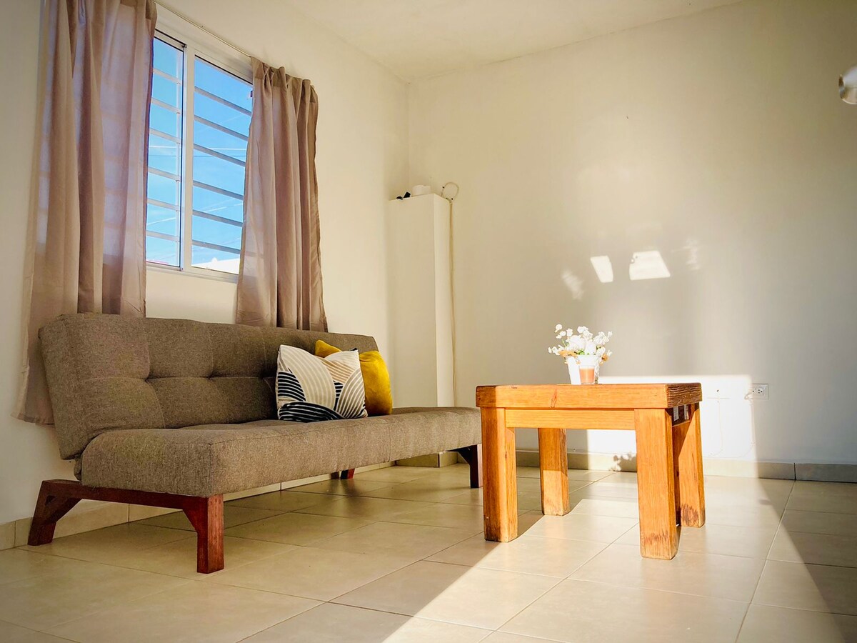 Con aire acond. y agua caliente. Hicimos este departamento buscando hacerte sentir como en casa y en una ubicación céntrica a 10-15 min de los principales puntos de la ciudad. Tiene un cajon de estacionamiento con portón eléctrico, pantallas en cada recámara y en la sala, todas con Prime. Cocina completa. Cerca hay muchas buenas opciones de comida y tiendas para hacer cualquier compra necesaria. Podemos darte sugerencias para turistear en la ciudad o cualquier otra necesidad. Facturamos