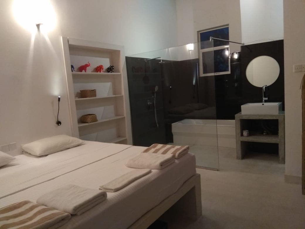"Cuando entré en la calzada de la casa no pude evitar asombrarme por lo que había detrás de la gran fachada de cristal. Case Mija es una villa muy bien equipada con suites muy cómodas y muy limpias. Su ubicación está en un tramo impresionante de playa que te dejará hechizado ”. Casa Mija es una residencia boutique frente a la playa, a 5 minutos de Mirissa y a 40 km de Galle, con una piscina privada y un conserje. Casa MiJa se puede alquilar como una villa completa o por habitación. Dormimos 16 personas en camas cómodamente