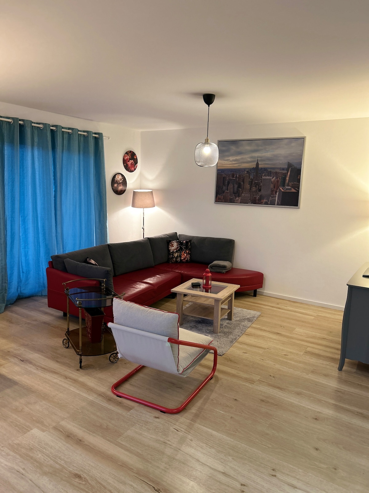 Disfruta de una estancia tranquila en un hermoso apartamento que forma parte de una casa de dos familias y tiene una propiedad similar a un parque. 3,5 habitaciones, cocina, baño - Dormitorio con habitación adicional contigua (solo separada por una cortina). - Otra habitación - Pasillo grande con sala de estar con TV y comedor con cocina abierta. - Plazas de aparcamiento para coches