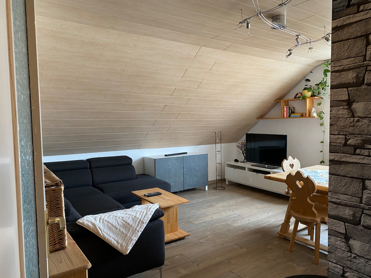 Apartamento, en el primer piso, dos zonas de descanso abiertas (sin habitaciones cerradas) con techo de escalera, balcones en todas las direcciones. ¡Una empinada escalera conduce al techo para dormir! Sin embargo, el sofá cama doble está en la zona de estar inferior. Zona de jardín con chimenea, sauna al aire libre. Cocina totalmente equipada, con cocina de gas. Hay especias disponibles, pero tienes que traer tu propio café. En verano, el agua de servicio se calienta a través del sistema solar. Puede que la calefacción tarde un poco en ponerse en marcha en Wolken.