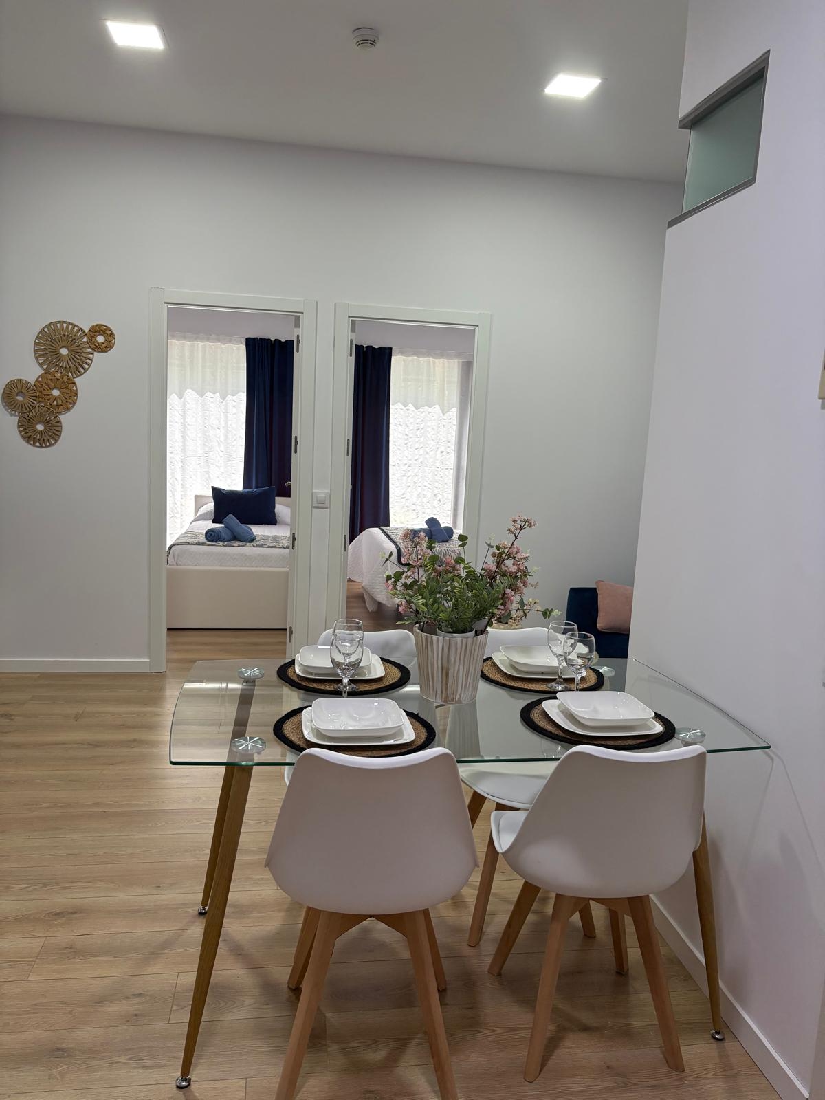 Bonito y luminoso apartamento resultado de una reforma integra de una modesta vivienda. Finalizada la reforma en octubre de 2021. Apartamento concebido y diseñado exclusivamente para el uso turístico. El apartamento tiene 2 dormitorios con cama de matrimonio, salón comedor, cocina totalmente equipada dos baños y patio privado. Situado a 5 minutos andando del casco histórico y de la estación de tren. Importante: Por favor antes de hacer la reserva leer las normas de la casa.