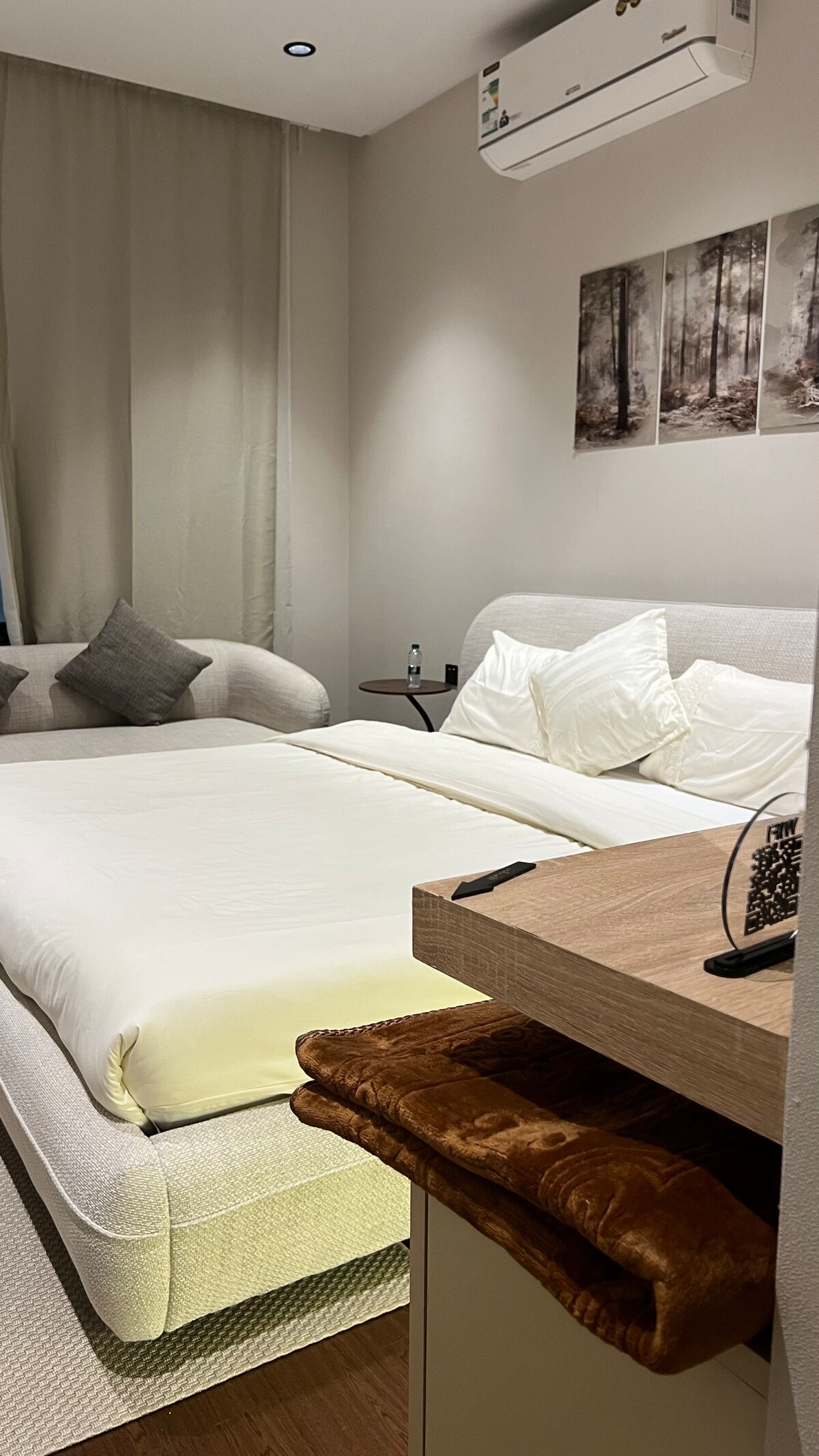 Disfruta de una experiencia de alojamiento de alta gama en un elegante estudio con un diseño moderno y una decoración de lujo que te ofrece un ambiente relajante y total privacidad. 🛏 Una cómoda cama con un diseño silencioso que te garantiza un sueño profundo. 🛋 Un elegante asiento lateral perfecto para relajarse o para un café especial por la noche. 📍 Una ubicación especial cerca de servicios y lugares vitales. La 🔑 elección perfecta para quienes buscan comodidad y lujo al mismo tiempo