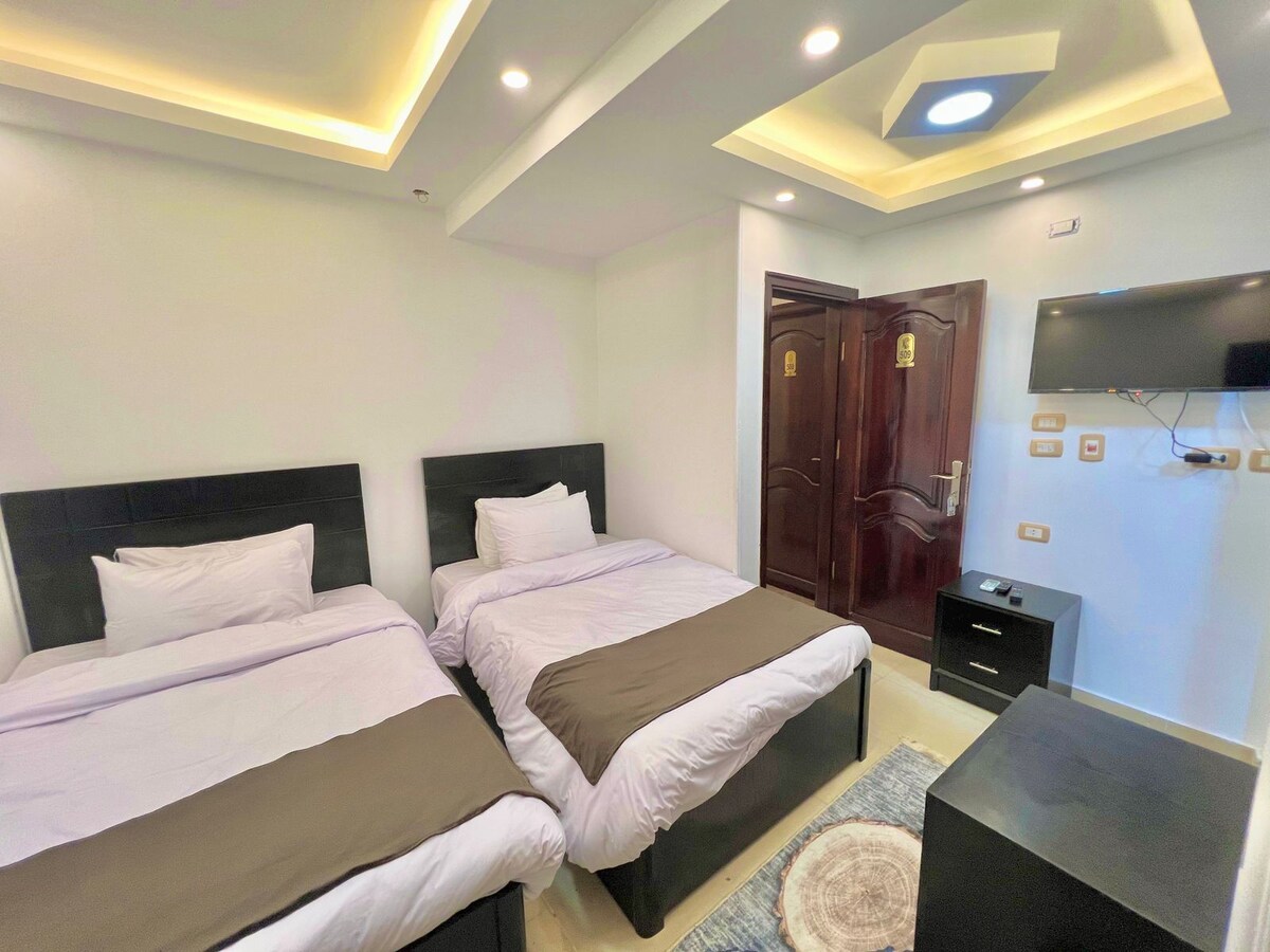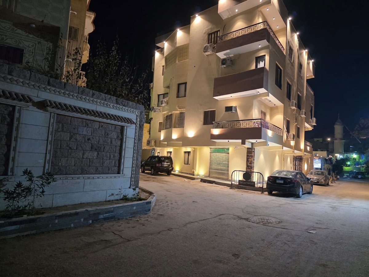 Alójate en nuestro limpio apartamento de dos dormitorios a solo 5 minutos de las pirámides y del nuevo museo. Nuestra casa tiene una cocina totalmente equipada y una acogedora sala de estar. Disfruta de internet de alta velocidad y de un televisor inteligente de 55 pulgadas. Convenientemente ubicado con fácil acceso a las principales atracciones y cerca de tiendas, restaurantes y cafeterías. Ofrecemos seguridad las 24 horas, los 7 días de la semana y llegada las 24 horas, los 7 días de la semana. Estamos deseando recibirte y ayudarte a disfrutar de una estancia memorable junto a las pirámides.