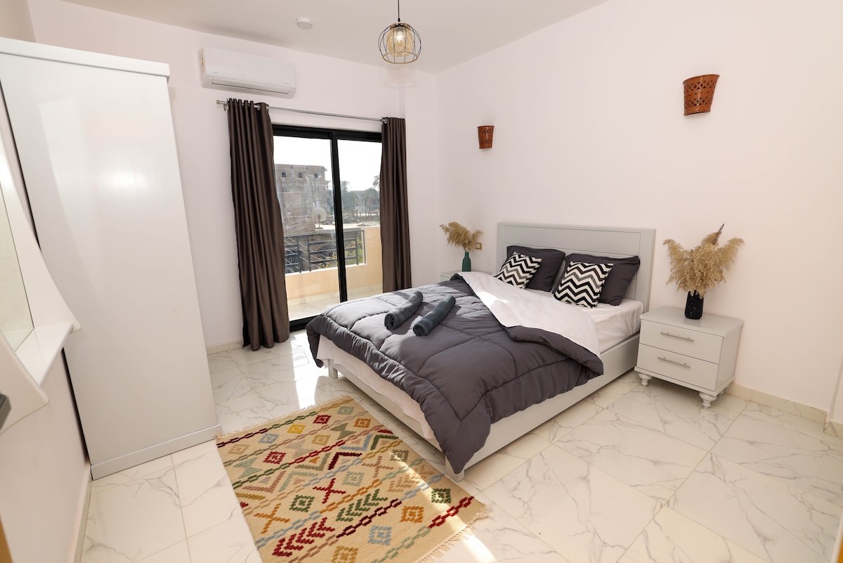 Una unidad de un dormitorio,primer piso, a 1 minuto de Colossi de Memnon y Medinet Habu, este acogedor espacio en el primer piso cuenta con un dormitorio tamaño king, sala de estar, cocina, baño y balcón con vistas panorámicas. Cerca de Deir el-Medina y el valle de las reinas (3 minutos). Aeropuerto de Luxor: a 20 minutos. En la calle principal de Memnon, cerca de tiendas, restaurantes y cafeterías. Fácil acceso al transporte local, Indrive y al sitio de globos aerostáticos cercanos, ¡perfecto para una estadía cómoda!