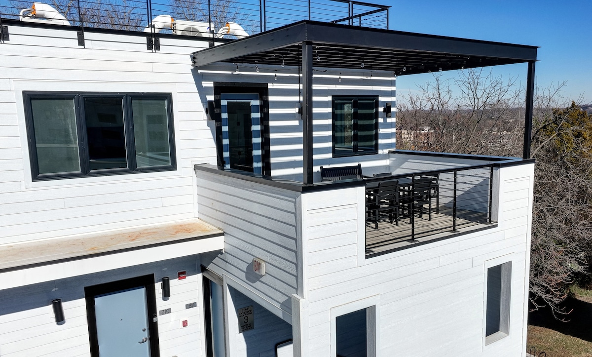 Modern Downtown Retreat con terraza en la azotea, 3 niveles, frente a The Ting Pavilion & C&O Restaurant, a 1 cuadra del centro comercial Downtown Mall. Impresionantes vistas a la ciudad y junto al ferrocarril C&O (1 lugar de estacionamiento en el garaje). Una combinación única donde los impresionantes lugares de interés se encuentran con el pulso animado de la vida urbana.