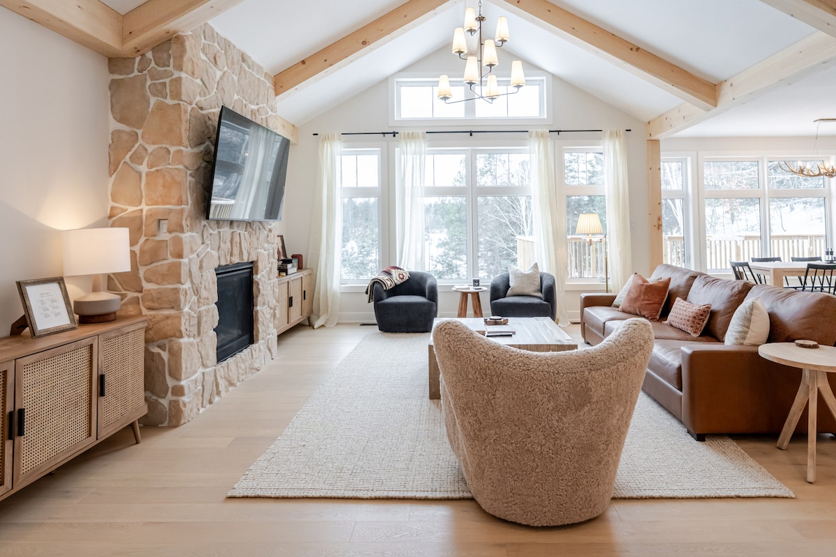 Te damos la bienvenida a The Wellair, tu mejor retiro de bienestar para relajarte y rejuvenecer. Esta impresionante casa frente al lago cerca de Huntsville combina el lujo moderno con la serenidad natural. Disfruta de impresionantes puestas de sol, acceso directo al agua y servicios de alta gama para una escapada de ensueño. Disfruta de interiores dignos de revista con muebles de lujo y cocina de chef. Mímate con bienestar; jacuzzi, sauna de barril de cedro, lujosas camas. ¡Explora senderos cercanos, relájate junto a la chimenea o la Sala Muskoka!