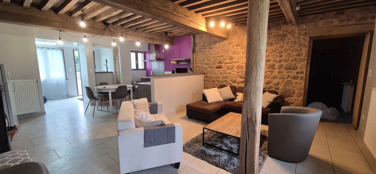 Casa fresca, cómoda y espaciosa (90 m2) en 2 plantas. Amplia cocina , salón y terraza a nivel de la calle y fabulosa habitación abierta de 1 dormitorio doble en el 2do piso. Una granja convertida en un alojamiento, situada en una montaña en un pueblo medieval a 16 minutos de la A6, esta tranquila casa es una parada ideal para unas vacaciones en los Alpes o en el sur de Francia. Ten en cuenta que hay un estudio con su propia entrada en la planta baja inferior, alquilado por separado.