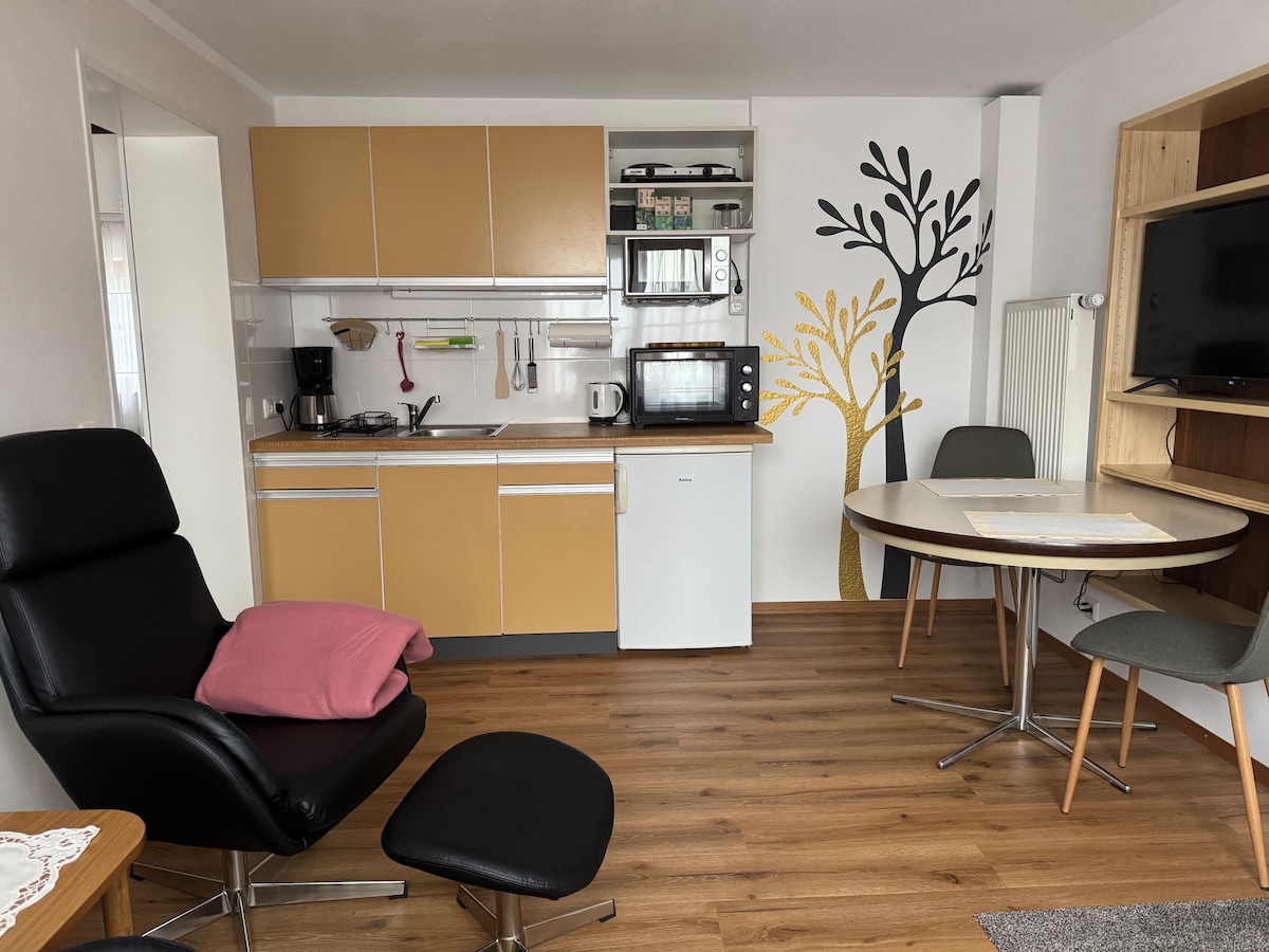 Una acogedora sala de estar y dormitorio abierta con cocina americana, mesa de comedor y escritorio separado, que invita a sentirse bien. El baño está equipado con ducha, lavabo e inodoro. En la cocina moderna encontrará todo lo necesario: cafetera Senseo, hervidor de agua, vitrocerámica, horno, microondas, nevera, ollas, vajilla, etc. Si falta algo, no dudes en ponerte en contacto con nosotros.