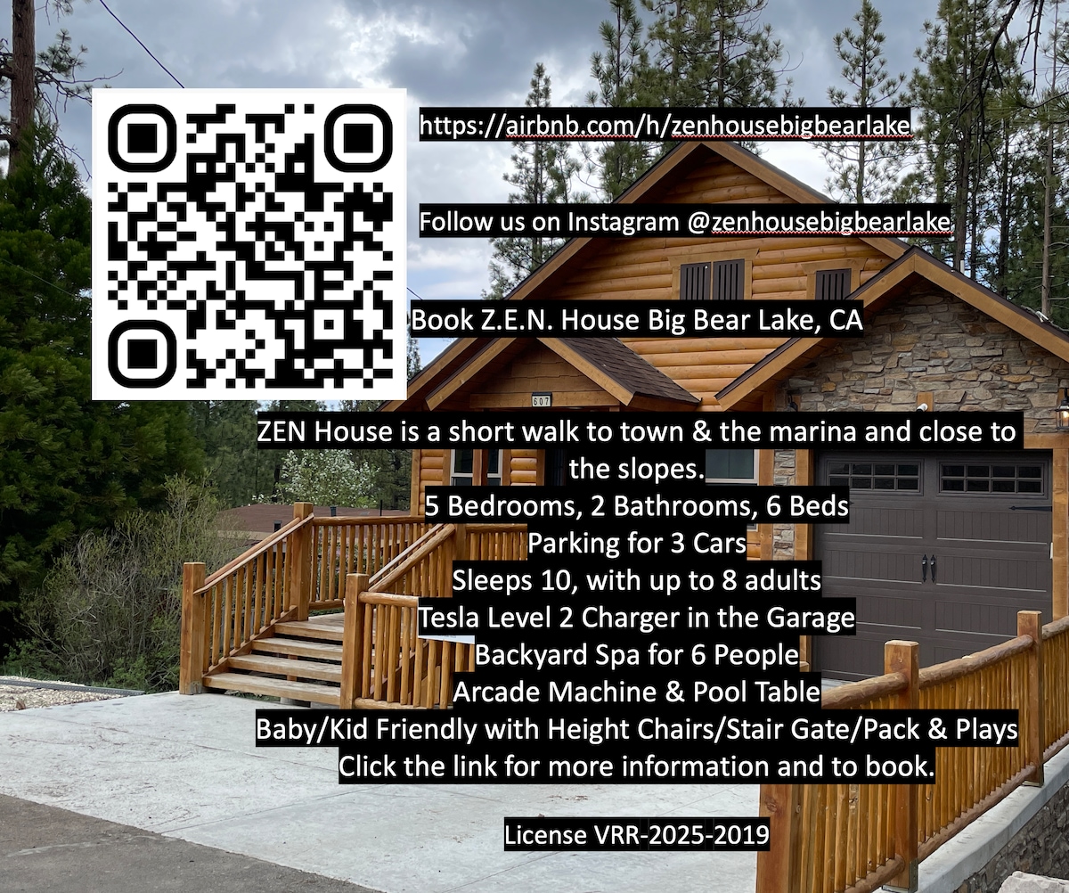 Nuestra página de inicio: Airbnb.com/h/zenhousebigbearlake Bienvenido a Z.E.N. House, que lleva el nombre de nuestros hijos. Compramos esta moderna cabaña para crear recuerdos duraderos. Tiene 5 dormitorios y 2 baños y capacidad para 10 personas con un máximo de 8 adultos. Aparca 3 coches. Está a poca distancia a pie de la ciudad y el lago, además de a poca distancia en coche para hacer senderismo y esquí. 50 $/perro, máximo 2 (ajuste de precio por más de uno por hecho después de la reservación) Licencia VRR-2025-2019