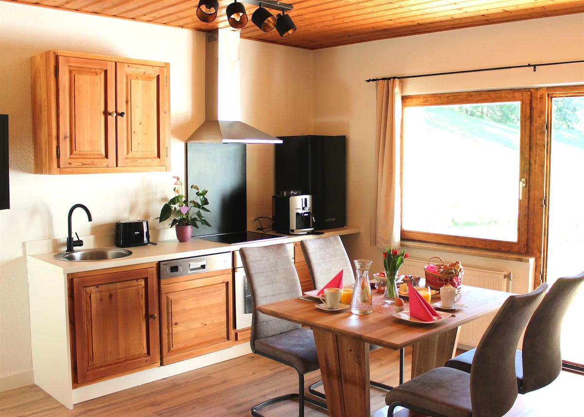 Nuestro departamento ofrece una experiencia única para el cuerpo y el alma con una vista fantástica del bosque y los prados. La naturaleza casi visible se refleja en el mobiliario: tanto el salón con la cocina pequeña como el acogedor dormitorio están equipados con telas naturales (cuero real) y madera de olor cálido (alerce, pino de piedra). La espaciosa terraza te invita a quedarte y respirar profundamente. También hay una moderna estación de parrilla disponible desde la primavera hasta el otoño. Toma tu acogedor albornoz y relájate después de un día lleno de acontecimientos en la relajante cabaña de infrarrojos y disfruta de la calidez de la ducha de vapor con la terapia de luz integrada. Tu oferta de bienestar se completa con productos cosméticos naturales y fruta fresca. Equipamiento del apartamento de bienestar: espacio habitable de 45 m2 para 4 personas, incluido un dormitorio separado y un sofá cama con un gran área tumbada en el salón. Acogedora sala de estar con una acogedora manta y TV de pantalla plana Cocina de madera totalmente equipada con utensilios de cocina, cafetera totalmente automática, nevera, lavavajillas, tostadora Cabaña infrarroja ¿Por qué la cabaña de infrarrojos? | Fortalece el sistema inmunológico | Aumentar la circulación de la sangre y mejora la apariencia | Alivia la tensión y alivia el dolor de espalda | Una estancia en la cabaña de infrarrojos tiene el mismo efecto que un entrenamiento de resistencia cardiovascular ligera. Baño moderno con ducha de vapor Balcón / terraza Muebles de jardín, tumbonas Área de barbacoa Pequeña cama o cuna adicional previa solicitud