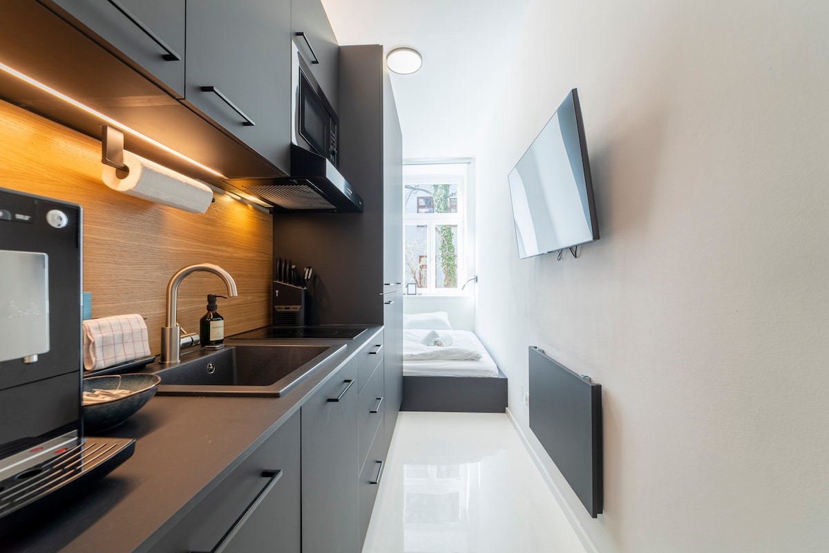 Entra en este elegante y moderno departamento de una habitación con servicios de primera calidad en el centro de Viena. Disfruta de una cocina totalmente equipada, una acogedora sala de estar con un sofá cama convertible y un dormitorio con una cama tamaño king, un amplio espacio de almacenamiento y una lavadora. Este departamento combina comodidad y funcionalidad en un edificio histórico con ascensor. ✔ Cama tamaño king ✔ Sofá cama ✔ Cocina totalmente equipada Wifi ✔ de alta velocidad ✔ Aire acondicionado Más información ↓