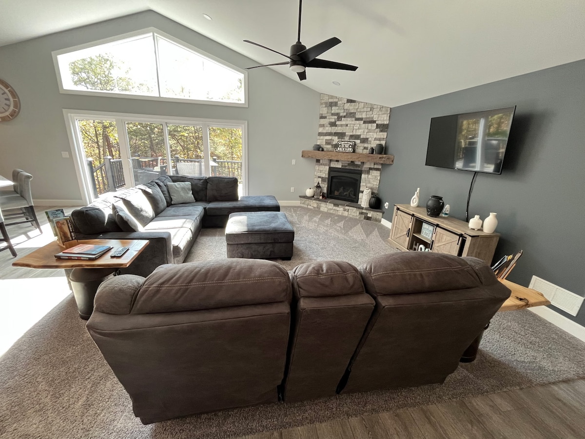 Amplia casa familiar de 4 dormitorios en 3 acres privados en la cima de una colina. A 1,5 millas del embarcadero Shy Beaver en James Creek. Hermosas vistas desde cada ventana. Vista al atardecer de Cove Mountain desde una gran terraza y chimenea. Mucho espacio en el patio para que los niños corran o para aparcar el barco. Patio cubierto para esos días de lluvia. Cable de 200 canales en 4 televisores, incluido un televisor inteligente de 75 pulgadas e internet de calidad Zoom en los 3 pisos. Cocina bien equipada, lavavajillas y aire acondicionado.