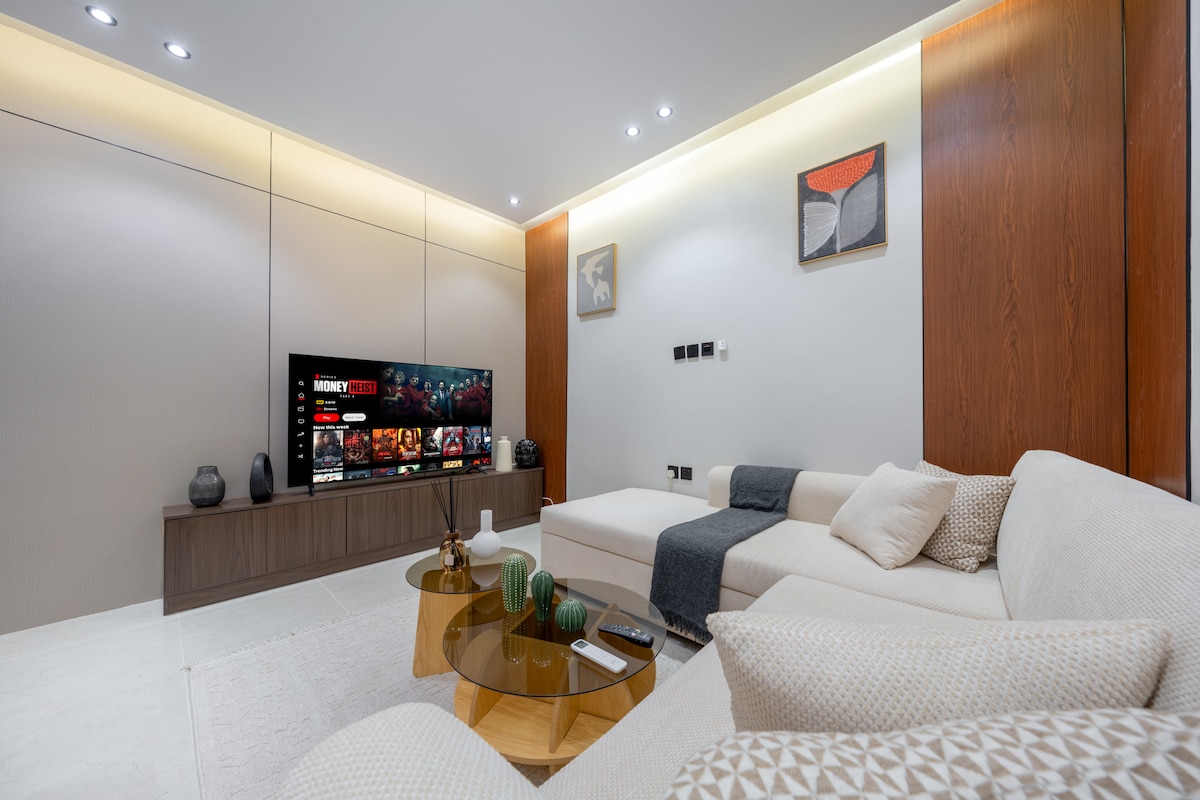 Lujosa sala de cine de 2 dormitorios + sala de estar con TV QLED de 85"