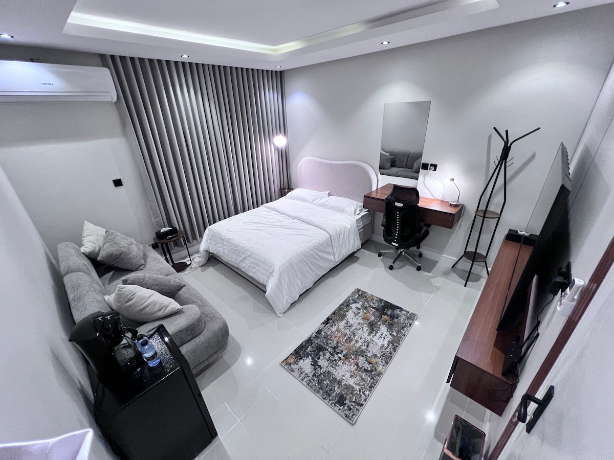 شقة استديو بدخول ذاتي في حي النزهة– الرياض. تتميز بالنظافة، أثاث أنيق، سرير مريح، أدوات استحمام، شاشة ذكية وإنترنت سريع. الموقع يبعد عن النخيل مول 7دقائق و عدت كافيهات ومطاعم في شمال الرياض تسجيل الدخول يتم بسهولة عبر القفل الذكي. يتوفر دعم يومي لأي احتياج، مع إمكانية طلب خدمة تنظيف للإقامة الطويلة.