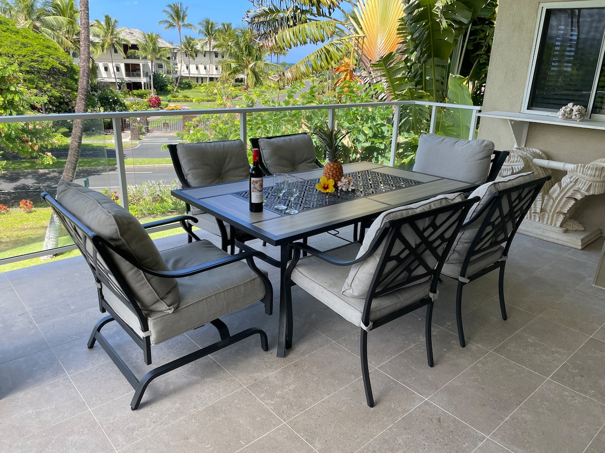 Enjoy your stay at this serene ground floor, remodeled in 2023, 1 bedroom 1 bath corner unit condominium in one of the best location of Waikoloa Beach Resort. * Lush tropical landscaping with ponds and waterfalls * Next to pool, tennis court, BBQ and fitness center * Walk to beach, shops, restaurants, entertainments and Grand Hilton * Free fast WiFi. Central A/C. Washer and dryer. * Spectrum Cable and Roku streaming TVs * Private Parking spot 50 yards from the front door
