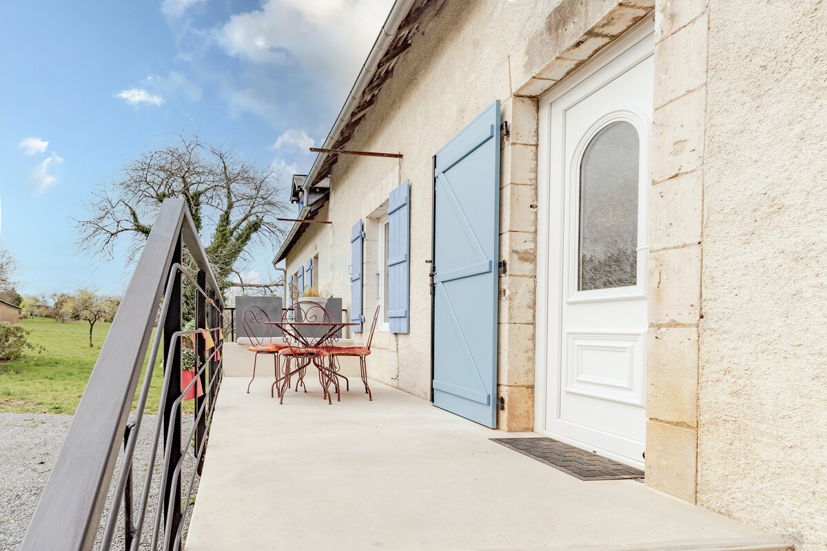 Preciosa y acogedora casa de campo para uno o dos en nuestra pequeña granja francesa en la hermosa y tranquila campiña del norte de Dordoña. ¡La cabaña está ubicada en 30 acres de campos y bosques donde puedes ver a nuestros muchos animales haciendo macetas disfrutando de su soleada jubilación francesa! Estamos a medio camino entre los bonitos pueblos de Mialet y Saint-Jory-de-Chalais, que están bien atendidos con tiendas, bares, restaurantes y panaderías. Ambos pueblos están a menos de 5 minutos en auto o a 30 minutos a pie.
