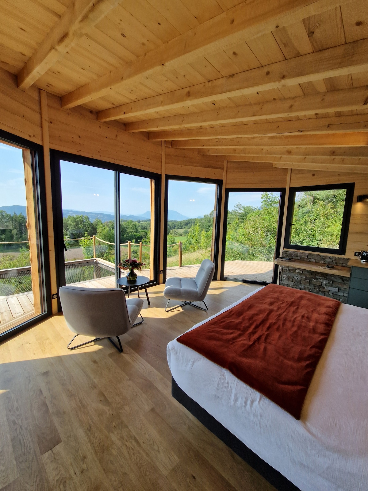 A Kota is a wooden house (originally a cabin with a barbecue and sauna) where you can get away from it all. Our Finnish Kota is located on our very quiet 3000m² plot, with its own terrace. It offers an unobstructed 360° view of the countryside and Le Semnoz. In our comfortable, heated and air-conditioned Kota, you'll find a double sofa bed (140x200, sofa bed), a dining table with two chairs, a kitchenette with an induction hob, microwave, and bathroom.