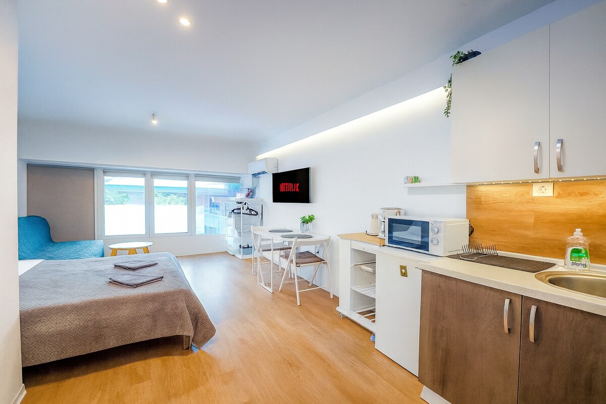 Estudio elegante y elegante en pleno corazón de la vida social de Salónica. Ideal para parejas, solteros o viajeros de negocios Alta velocidad, Internet, colchón de alta calidad, una máquina Nespresso y Netflix. Lavadora/secadora, plancha y tabla de planchar. A solo 2 minutos del paseo marítimo y del puerto, y a 5 minutos de la plaza Aristotelous.