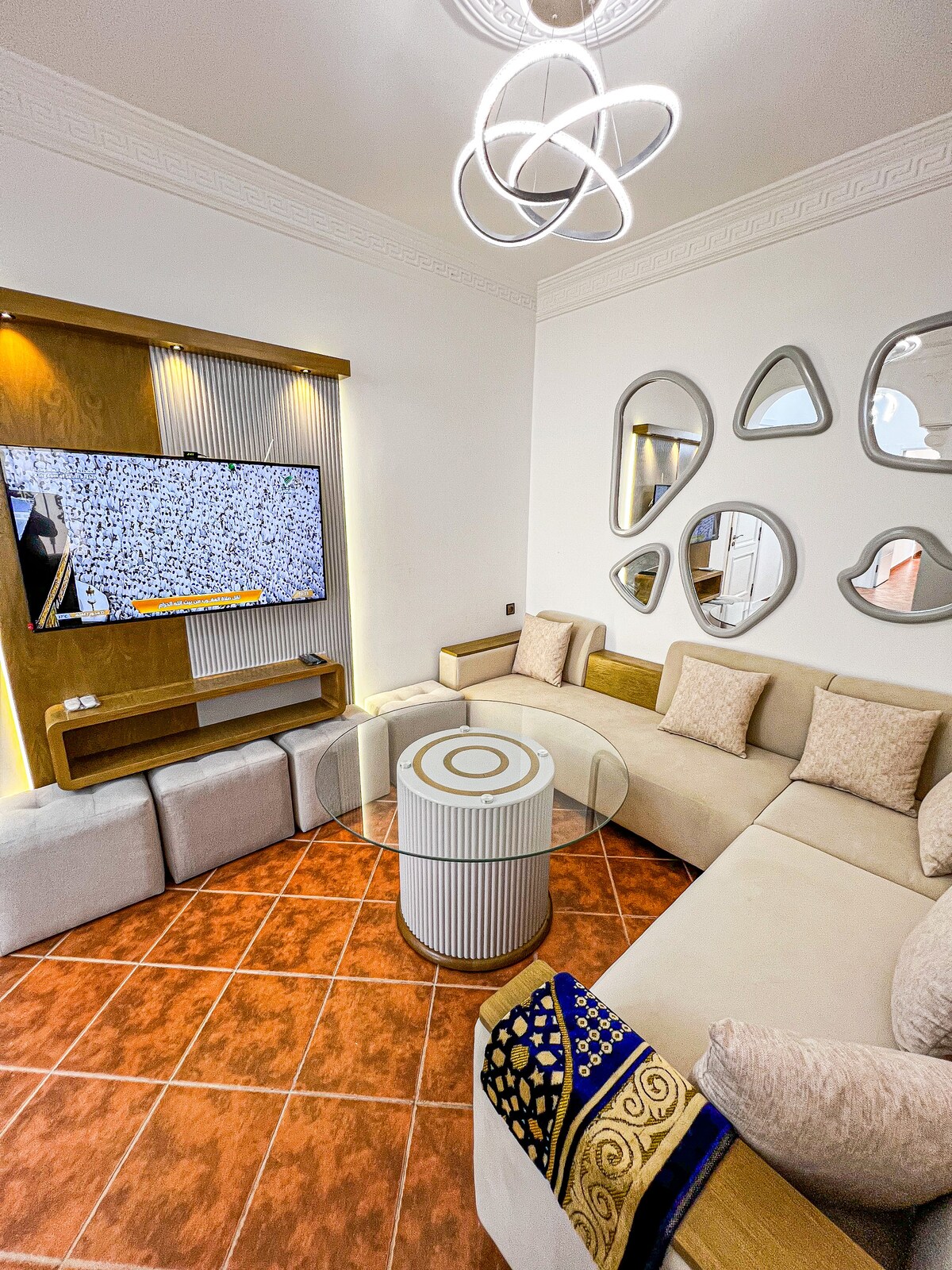 Disfruta de una estancia tranquila donde todo está a pocos pasos sin necesidad de coche. Camina hasta el aeropuerto, tómate un café abajo o cena en los mejores lugares de Tetuán, como McDonald's, Little Mama, Picks y La Dorada. El apartamento es tranquilo, sin ruido de la calle ni obras, perfecto para dormir bien. Estás a solo 10 minutos de Marina Smir Beach, a 15 minutos de la antigua Medina, a 45 minutos de Ceuta, a 45 minutos de Tánger y a 1 hora de Chefchaouen. Cocina totalmente equipada, TV en cada habitación, aparcamiento privado y cafeterías en la planta baja.