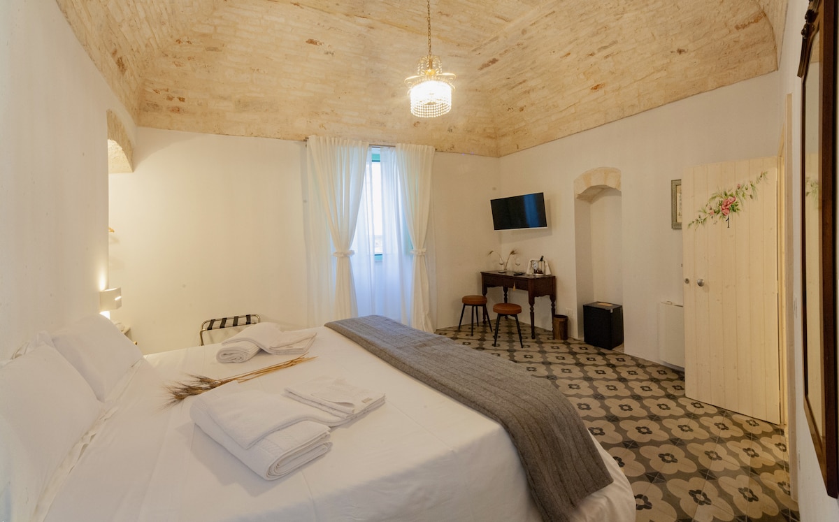 B&B en una Masseria del siglo XVII, rodeada de 8.500 metros cuadrados de olivares centenarios, a solo 20 minutos de las playas de Ostuni. 2 Junior Suites y 2 suites con acceso directo e independiente desde el patio. Paredes blancas deslumbrantes, patios aislados, arcos, detalles de piedra y encantadoras paredes de piedra seca. Desayuno con productos orgánicos de origen local: pan de grano antiguo horneado, fruta de nuestro huerto histórico y pasteles caseros preparados diariamente por Patrizia.