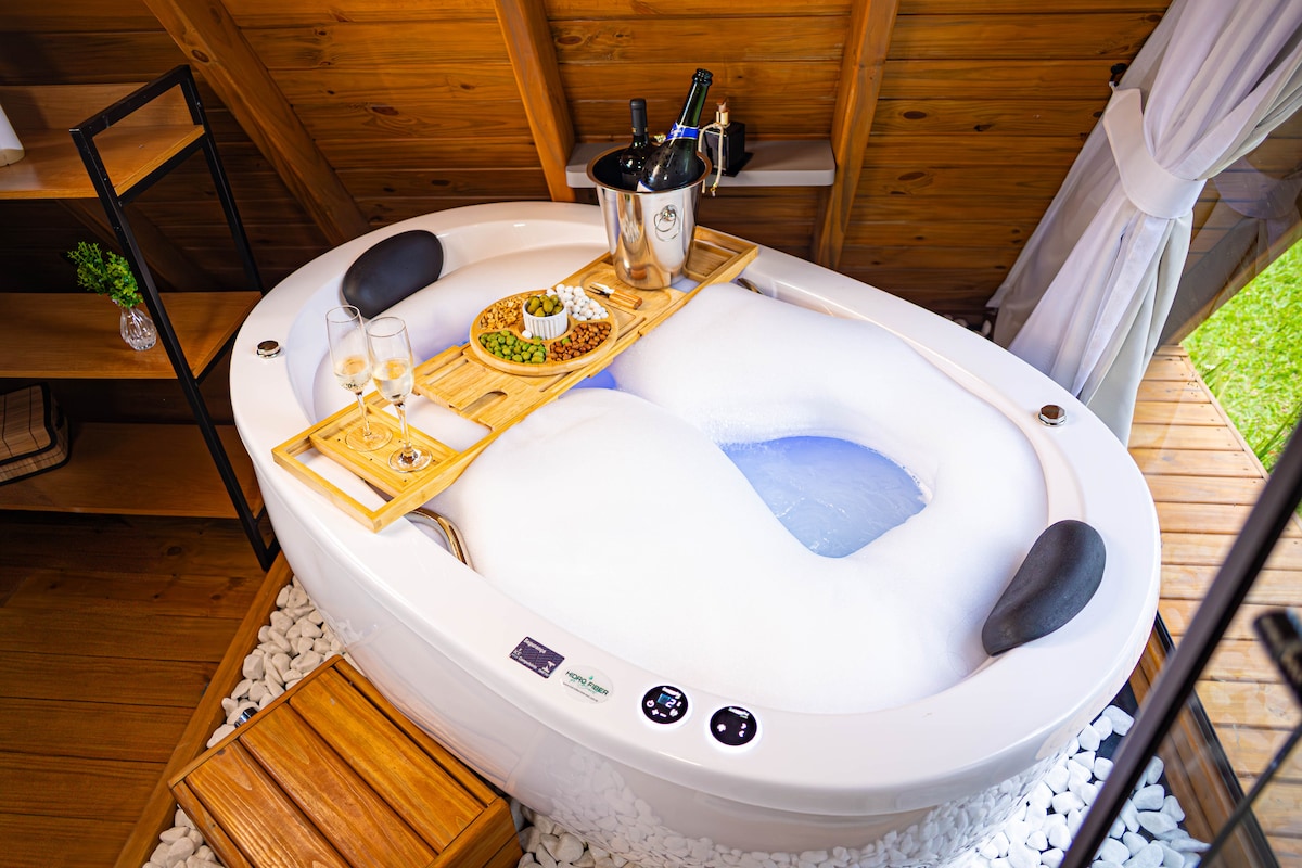 Disfrute de un refugio romántico en nuestra cabaña en la terraza, rodeada de naturaleza. Relájese en el jacuzzi mientras disfruta de la vista del bosque. Cocina completa, habitación acogedora y parrilla portátil para momentos especiales en pareja. O disfrute de la serenidad junto a la piscina, saboree una barbacoa romántica y disfrute de la privacidad del entorno. Con una cocina completa, un equipo de música y un ambiente tranquilo, es el escenario ideal para una escapada en pareja.