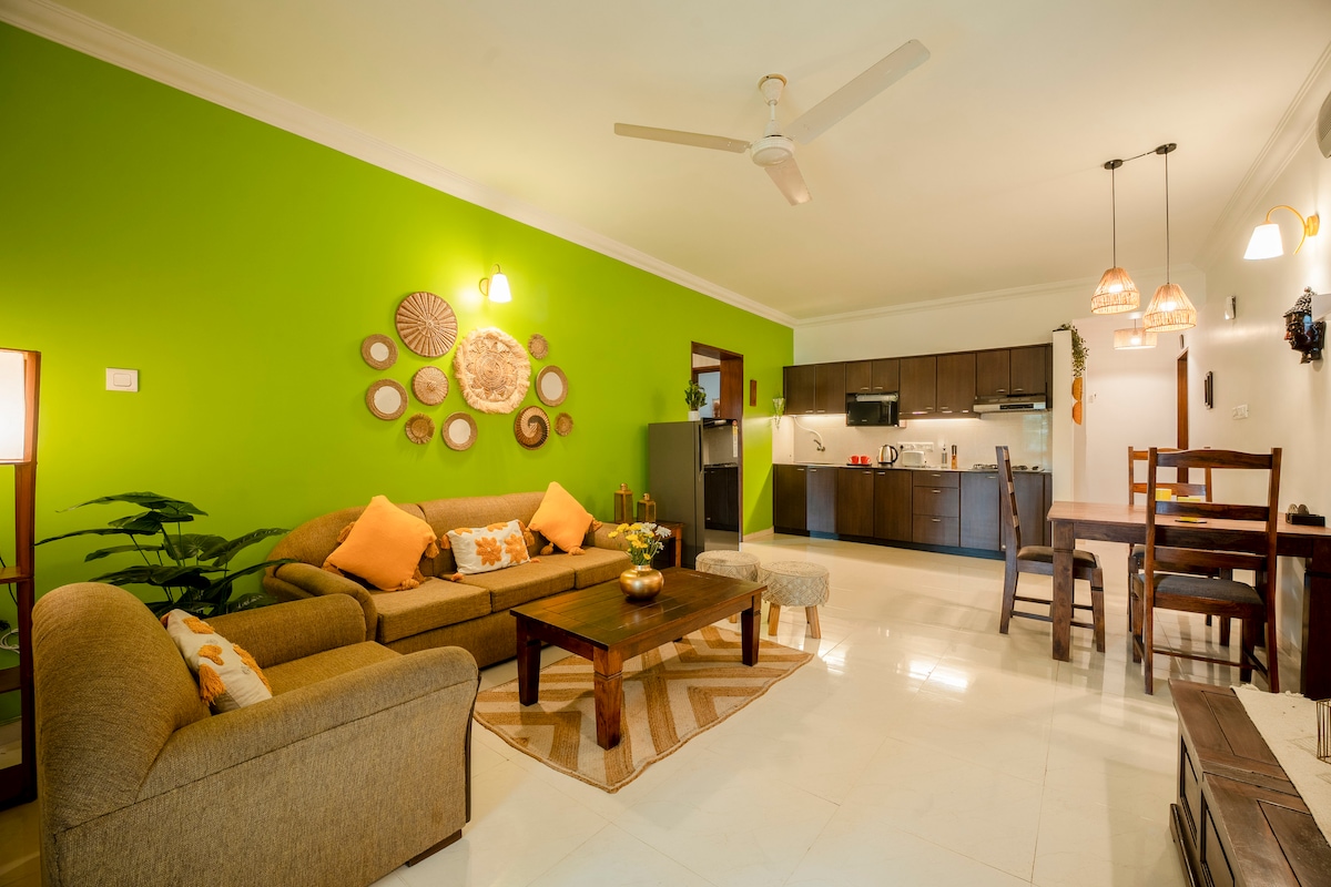 Te doy la bienvenida a mi acogedora casa de vacaciones. Ubicado entre innumerables cocoteros, aquí se respira el ambiente de Goa. Este apartamento de 1 habitación es perfecto para hasta 3 personas y tiene todo lo que necesitas. Wifi, una cocina bien surtida, un amplio balcón y sala de estar, una televisión inteligente, buenas vistas y, por supuesto, ¡buenas vibraciones! Puedes darte un relajante chapuzón en la piscina, hacer ejercicio en el gimnasio o saltar a la dulce playa de Uddo para ver el atardecer y hacer kayak. Ubicación céntrica pero tranquila en una hermosa comunidad cerrada.