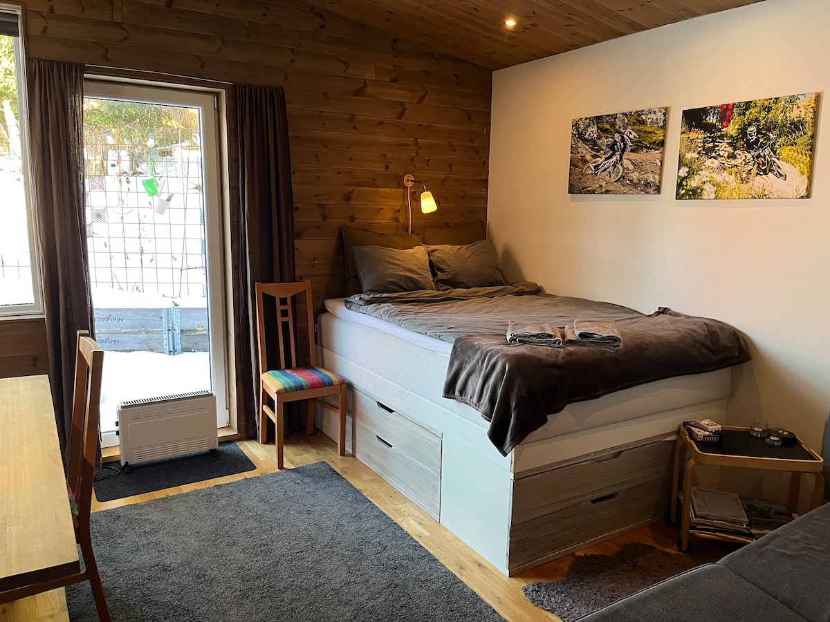 Casa (25 metros cuadrados). Entrada privada, inodoro, cabina de ducha y lavadora. El precio incluye ropa de cama, toallas y limpieza final. Una habitación grande con una cama (140 cm), sofá (que se puede utilizar como cama) y escritorio. NO HAY COCINA, pero hay una nevera pequeña, microondas y hervidor de agua. Como una habitación de hotel, pero más grande. Buenas instalaciones de almacenamiento y secado. Wifi, TV con Apple TV. Parte propia del patio. No se limpia en invierno. Plaza de aparcamiento junto a la casa. Entrada "Trixy" arriba, debido a las condiciones de la carretera.