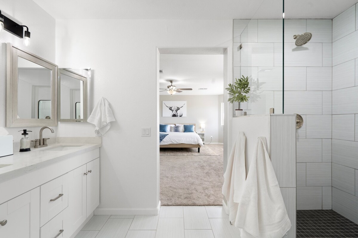 - Cama tamaño king - Chimenea exterior - Wifi de alta velocidad. - Cocina de chef - Bañera de hidromasaje. Cuando entres en esta serena casa de Queen Creek, te encontrarás con un enorme concepto abierto. La cama tamaño king de lujo te adormecerá justo después de darte un baño caliente en la bañera gigante. Siéntate junto a la chimenea de gas al aire libre para calentarte y luego relájate en el jacuzzi inflable para 2-3 personas. Barbacoa de gas al aire libre y cocina interior totalmente equipada. La piscina comunitaria está justo al final de la calle. La piscina no está climatizada.