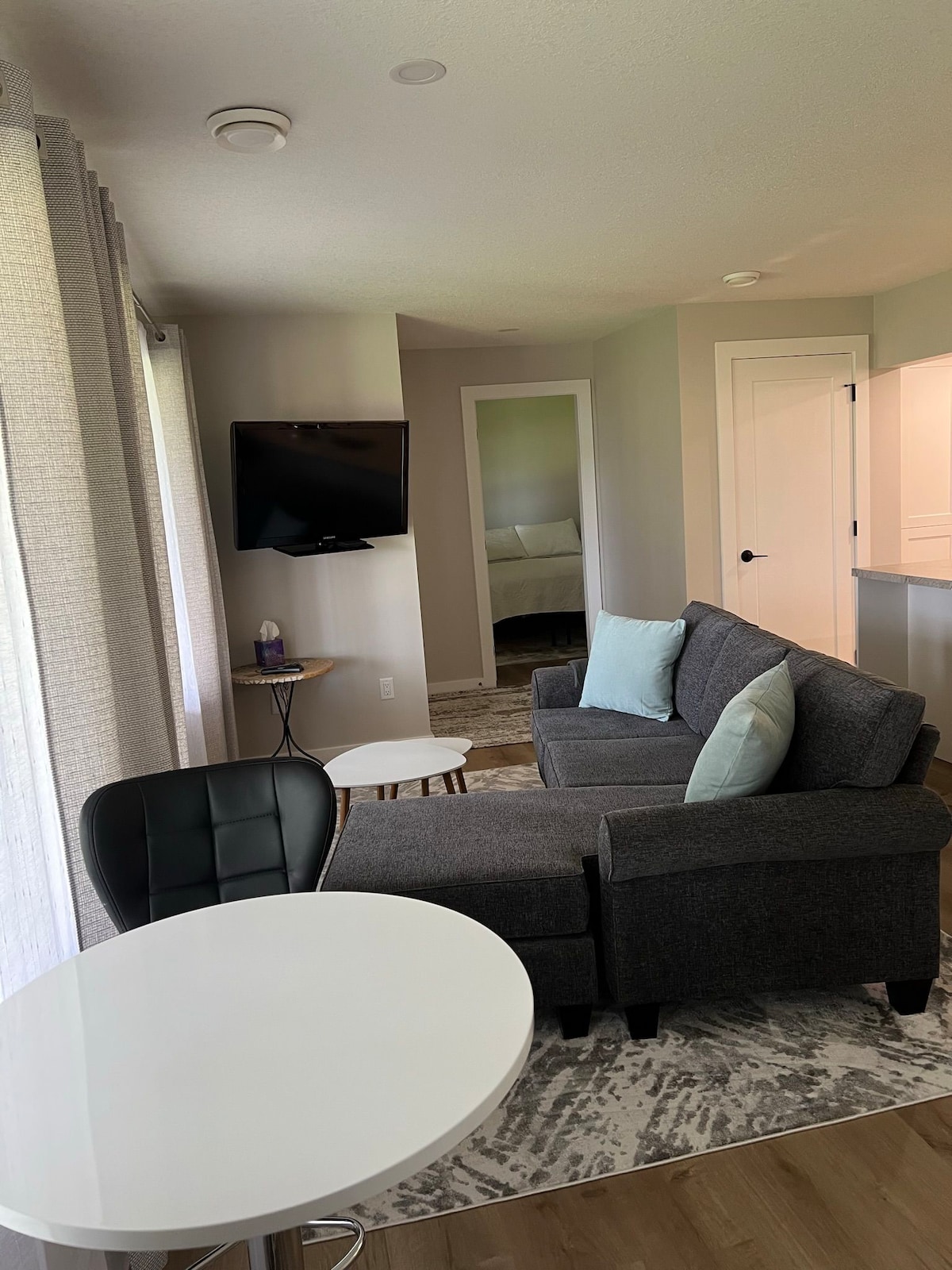 This cozy little secondary suite is located on a quiet street minutes from downtown, trails, beaches, and all amenities! The kitchenette is well appointed with various supplies and essentials. On the other side of the room is a comfortable queen bed with fresh linens and plenty of pillows. Also included in the suite are a well stocked 3-piece bathroom, a dining set, a small closet, and a smartTV. Nothing beats relaxing in the hot tub after a day filled with adventures!