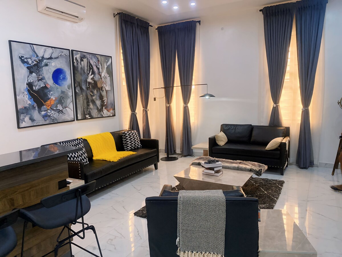 El apartamento con servicios incluidos Cinnovationz de 3 dormitorios se encuentra a 10 km del aeropuerto internacional de Asaba. Totalmente amueblado y diseñado para servir a una familia de 6 personas que buscan tener una experiencia familiar única pero asequible. El apartamento de 3 dormitorios está amueblado con modernos televisores de pantalla inteligente, espacio de cocina totalmente amueblado, Internet rápido, lavandería dedicada, servicio de transporte al aeropuerto de pago, vecindario totalmente seguro y ubicación privada. Los 3 dormitorios ofrecen un mobiliario único, tranquilo y moderno.
