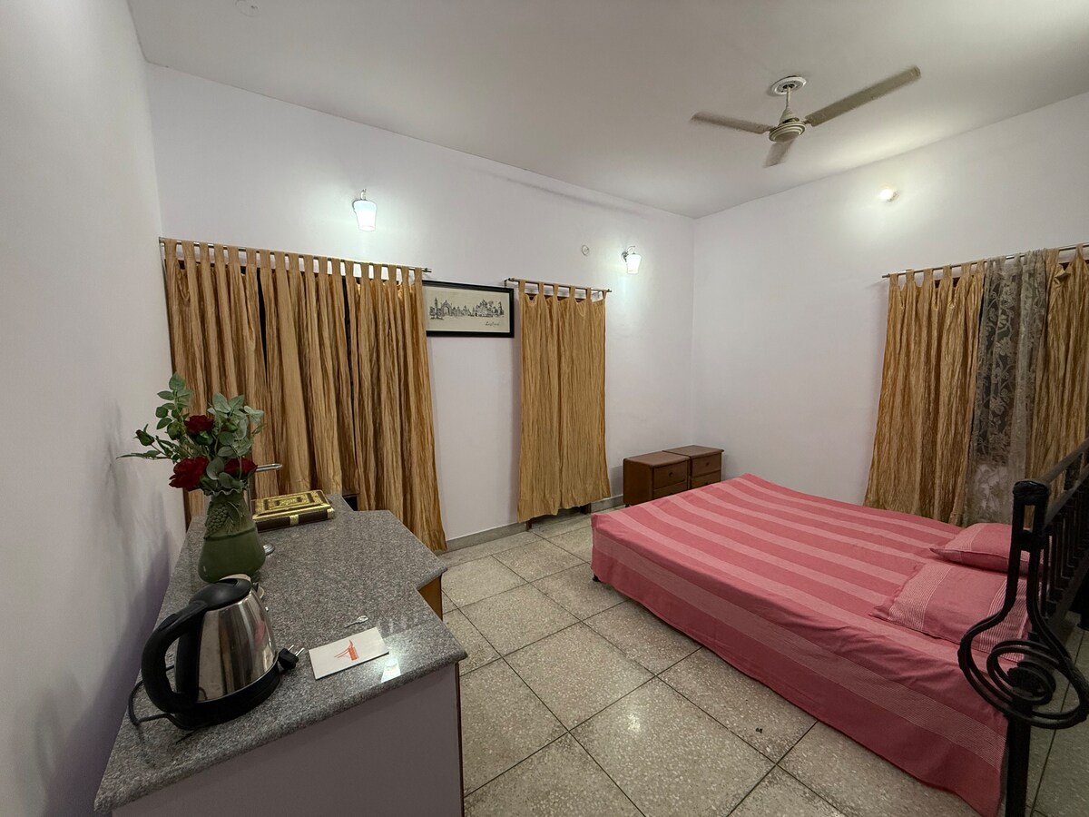 Experience luxury at this centrally located 1BHK on ground floor of the villa. 🏡 Just minutes from the metro in a peaceful, safe neighborhood, this home blends convenience with elegance. Step into grand interiors featuring marble floors, rich wood paneling and great ventilation. Unwind in the beautiful garden 🌿, or enjoy fresh air on balcony. Complete with a full kitchen, all essential amenities and ample parking, it’s your perfect city retreat! ✨
