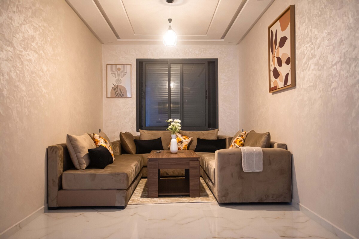 Welcome to our modern, cozy apartment where comfort meets style. Enjoy a bright living room with navy sofas, a sleek kitchen, and a dining area for six. The space includes fast WiFi, a flat-screen TV (Bein sports, IPTV service), and elegant décor. Large windows fill it with natural light and calm energy. Just 3 mins to the train station, 2 mins to Carrefour and 5min driving to the beach & City Center…(not allowed to unmarried couples) Perfect for relaxing short or long stays.