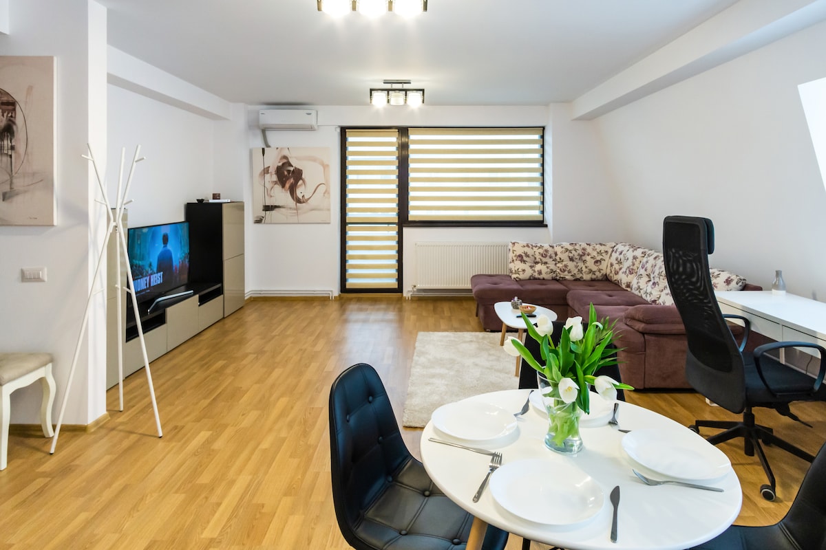 Tu familia estará cerca de todo, alojándose en este alojamiento céntrico. El apartamento tiene 2 habitaciones, ubicadas en una zona tranquila, en la calle. Banca Nationala, muy cerca de todos los puntos de interés de la ciudad: - A 5 minutos a pie del centro de la ciudad (600 m). - A 10 minutos del centro comercial Arena. - A 2 minutos de la estación de autobuses. - A 3 minutos de Mega Image, supermercado, panadería, etc. Dormitorio con cama de 160x200 Un sofá cama en la sala de estar Televisión Refrigerador, estufa, cafetera Oficina