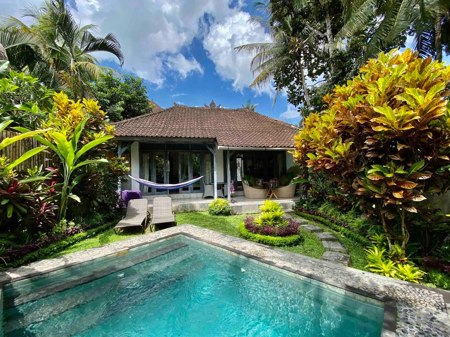 Casa de un dormitorio con diseño minimalista, con vistas a los campos de arroz. Baño privado con agua fría y caliente a presión. La casa tiene una cocina abierta con zona de cocina y utensilios de cocina básicos. Pequeño jardín tropical con ducha al aire libre, una impresionante piscina privada con solárium. Se encuentra a 15 o 20 minutos a pie del centro de Ubud, el palacio, el mercado y el bosque de los monos. Disfruta del desayuno flotante junto a la piscina, es especial bajo petición.