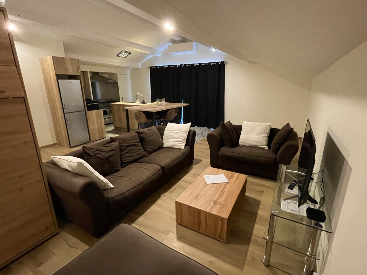 Venga a disfrutar de un alojamiento independiente de 60 m2 (situado en una casa) totalmente equipado y decorado con buen gusto. Relájese con la piscina de agua salada (10 x 5) y el jardín de 2300 m² con juegos para adultos y niños: petanca, ping pong, cama elástica… El alojamiento está totalmente equipado: placa de inducción, horno, tostadora, cafetera de cápsulas tipo Nespresso, TV con Netflix, wifi (fibra), juegos de mesa,... Plaza de aparcamiento para este alojamiento disponible en el jardín.