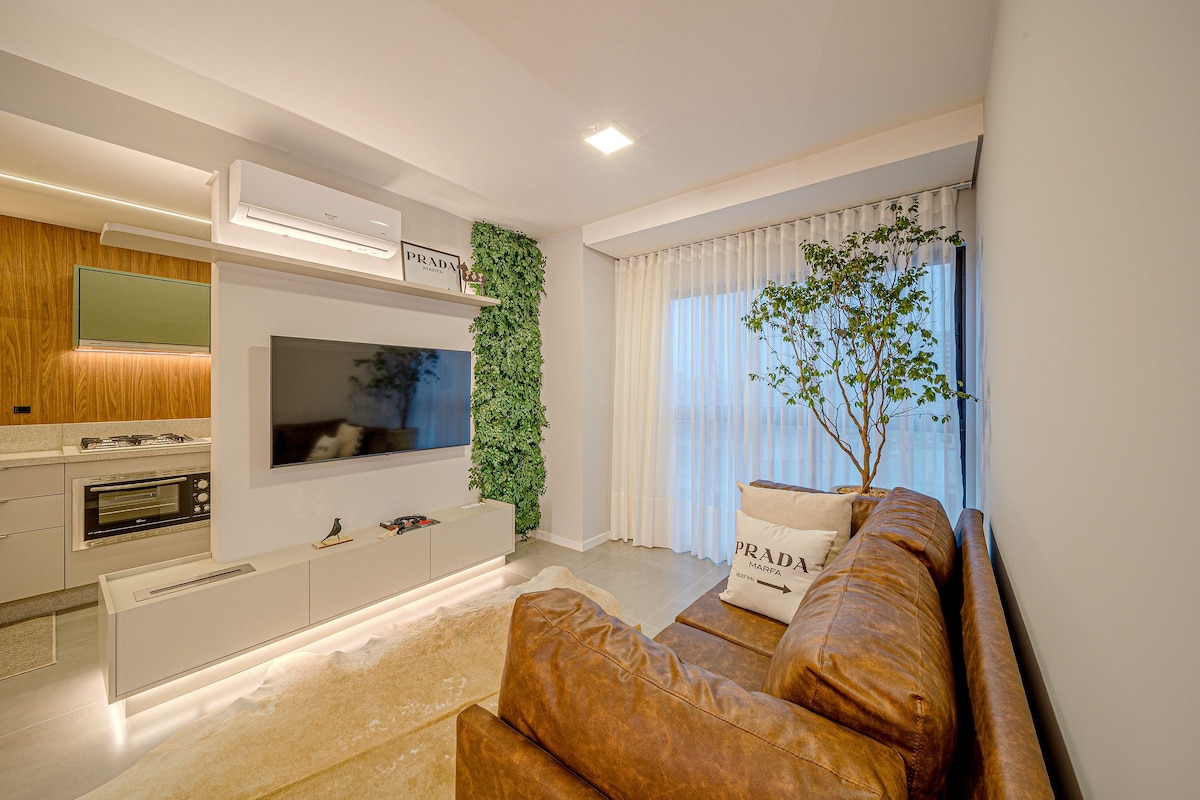 Apartamento de 40m, um quarto e uma vaga de garagem coberta. Hospede-se conosco e desfrute de uma vista incrível para a Serra e uma piscina no rooftop. O apartamento é novo, conta com móveis planejados e eletrodomésticos novos e modernos. Roupas de cama e toalhas das melhores marcas, limpeza impecável. Planejamos tudo pensando em hospedar você! O prédio está localizado na região central da cidade de Joinville, a 4min do Festival de Dança, 13min do Aeroporto, 8min até o Garten Shopping.