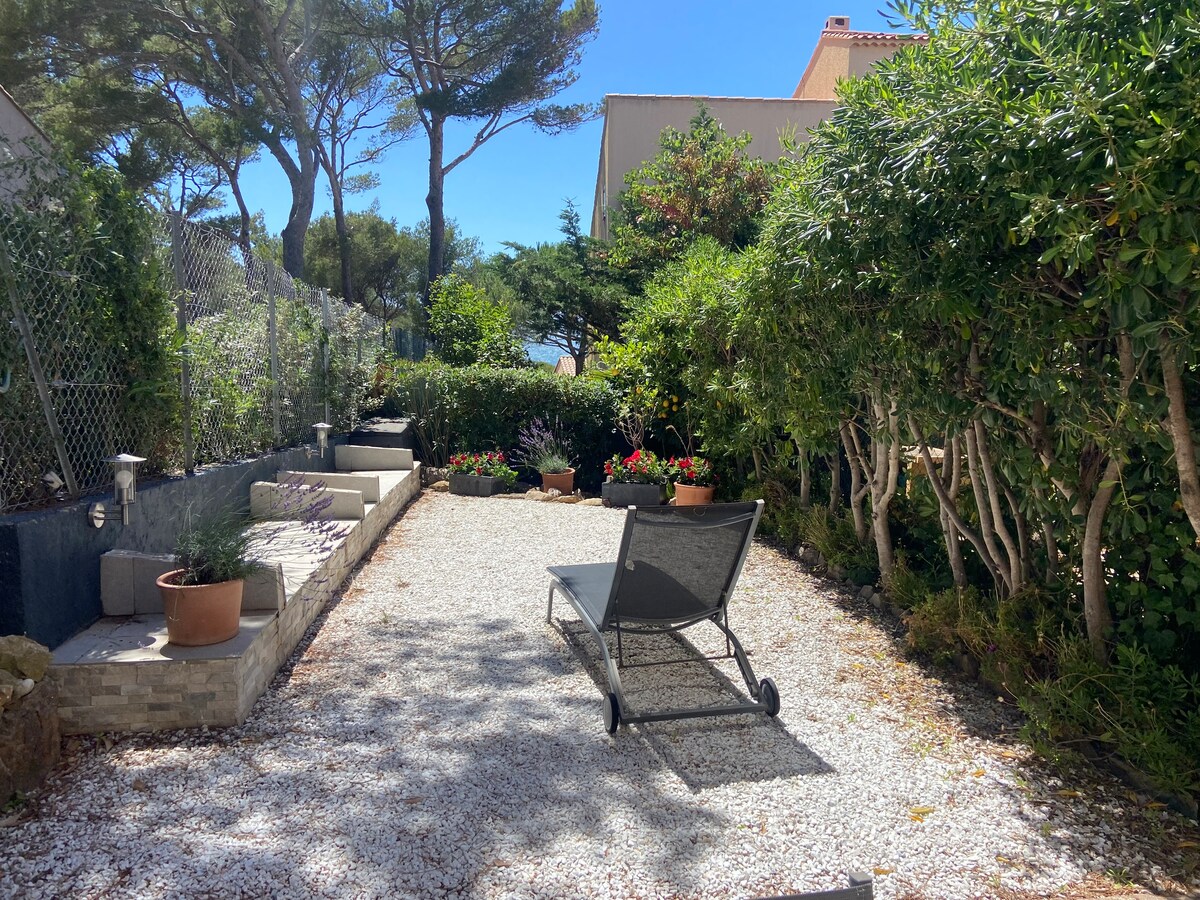 Relájese en este alojamiento totalmente renovado, con todas las comodidades, de 2 habitaciones, independiente, de una sola planta, con aire acondicionado, un gran jardín privado y aparcamiento seguro. A pie a 5 minutos del mar para las diversas calas y 10 minutos para la playa de arena y 15 minutos del centro de la ciudad (tiendas y puerto). Jardín privado amueblado: zona de comedor bajo pérgola, con plancha, nevera/congelador, zona de estar, zona de solárium con tumbonas y juegos (ping pong y petanca) y ducha tibia exterior y tendedero.