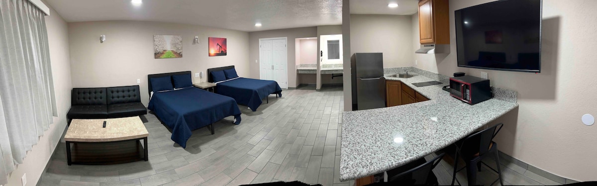 Descubre la comodidad en nuestro acogedor apartamento tipo estudio ubicado en el corazón de Bakersfield, California. A solo unos minutos de las delicias culturales y culinarias de la ciudad, nuestra casa totalmente surtida promete una estancia perfecta con todos los elementos esenciales a tu alcance, café fresco, licuadora, tostadora, microondas, etc. Ya sea que estés aquí por trabajo o vacaciones, nuestro acogedor refugio ofrece la combinación perfecta de comodidad y relajación. ¡Se permiten niños! Se admiten mascotas. Cocina totalmente abastecida. Wi-Fi gratis