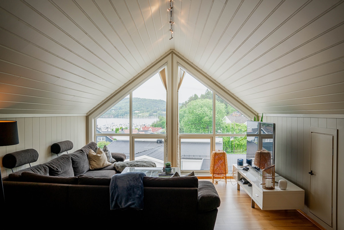 Relájate con toda la familia en esta tranquila residencia con vistas panorámicas del fiordo, a poca distancia de tiendas, restaurantes y del mar con una zona de baño. Hay un gran apartamento en 1.etch., su propia escalera y entrada, 91 metros cuadrados, 3 dormitorios, sala de estar con sofá cama y 3 sillas de cuero, horno de chimenea, bomba de calor. En el baño, el lavabo, el cubículo de ducha, la lavadora y la secadora, el lavabo y la secadora combinados, la cocina y la habitación pequeña al lado, tienen estacionamiento gratuito. Solo se permite fumar afuera.