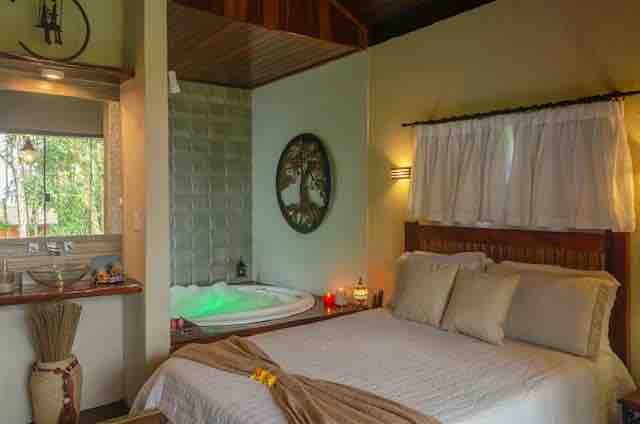 - Chalé Beija-flor Master de 70 metros cuadrados, super cómodo con dos ambientes, cama king size, jacuzzi, chimenea, minibar, baño con ducha, TV de 43 pulgadas 4k (TV por suscripción con canales en HD), WI-FI, sala de estar, aire acondicionado frío y calor, lavabo separado - Mini cocina, mesa de comedor, cafetera, microondas y utensilios de cocina completos y un hermoso balcón con vista al río. Nota: Niños hasta 5 años tarifa cero. Niños de 6 a 12 años: 20% de la tarifa diaria.