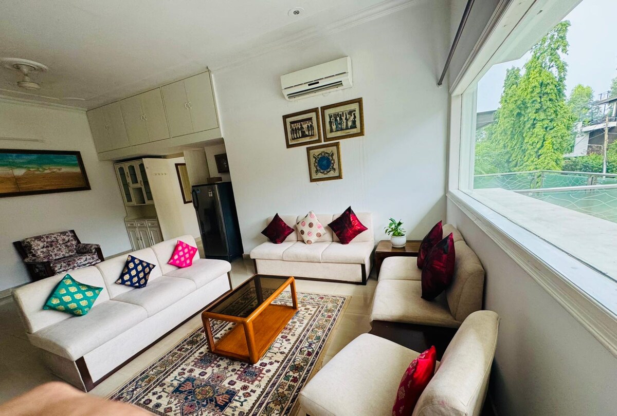 Great One Kanal Villa (First Floor) which is class, and ultra spacious. Extremely well located. All the three bedrooms are extra large and airy, having large balconies, each designed to provide you with ample space and comfort. All three bedrooms have attached closets and bathrooms. Each bedroom comes with a king sized bed, table, chairs, sofa and a king sized sofa cum bed. The living room and dining space is very cozy and huge. Also living room has adequate desk space for office work.