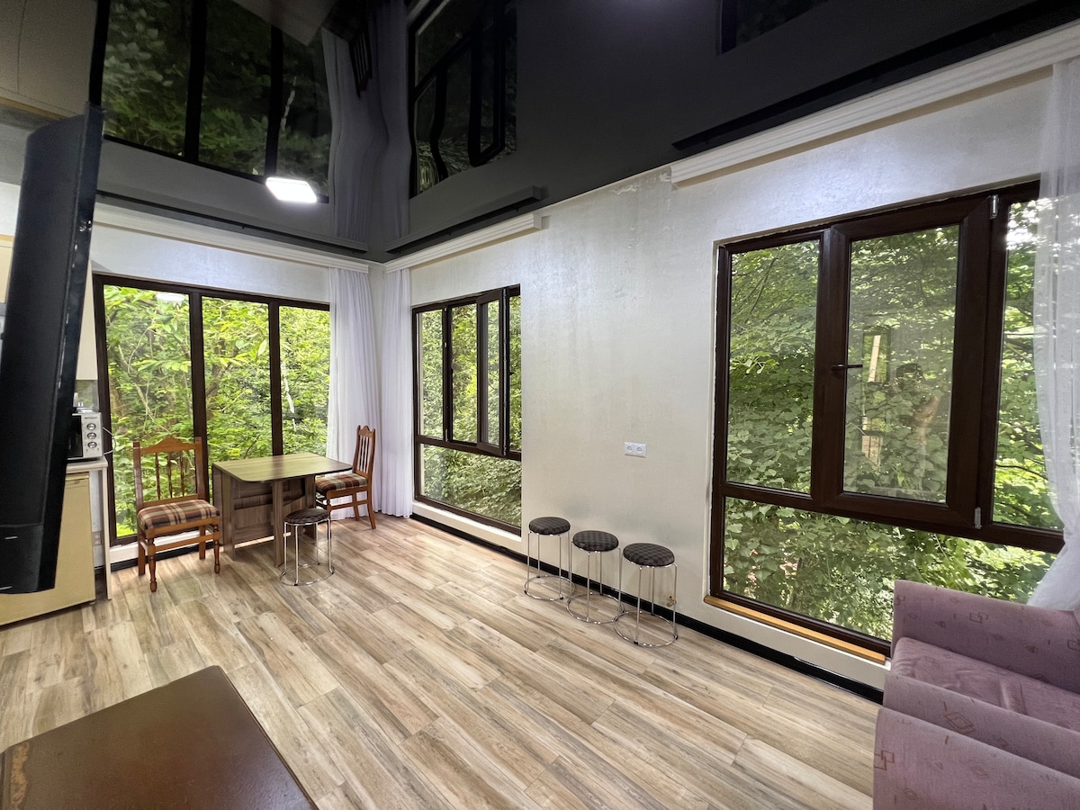 Welcome to our cabin Greenland Pheria, where rural atmosphere meets comfort in the vibrant heart of nature. This bright and stylish cabin offers stunning sea and mountain views from your private balcony and bay windows, just a stone's throw away from city of Batumi. Enjoy the convenience of complimentary air conditioning and Home Theater Projector among other modern amenities.